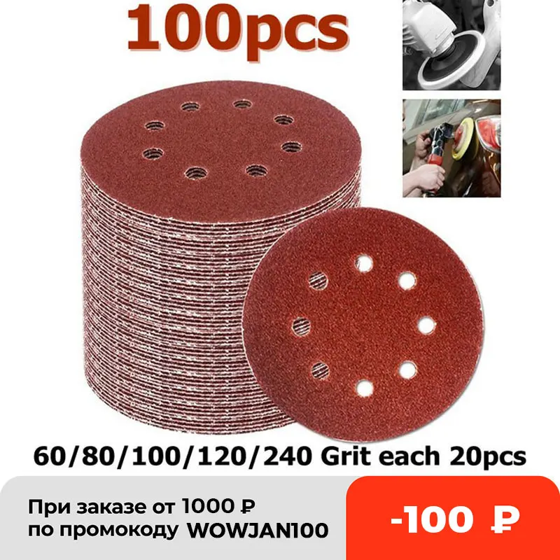 Наждачные диски круглой формы, зернистость 100 мм, 125 мм, 60, 80, 100, 120, наждачная бумага, 8 отверстий, 240 подушечек, каждый из 20, Полировочная, шлифовальная машинка шт.