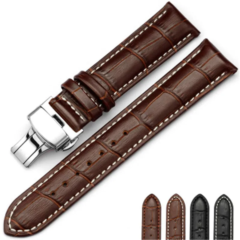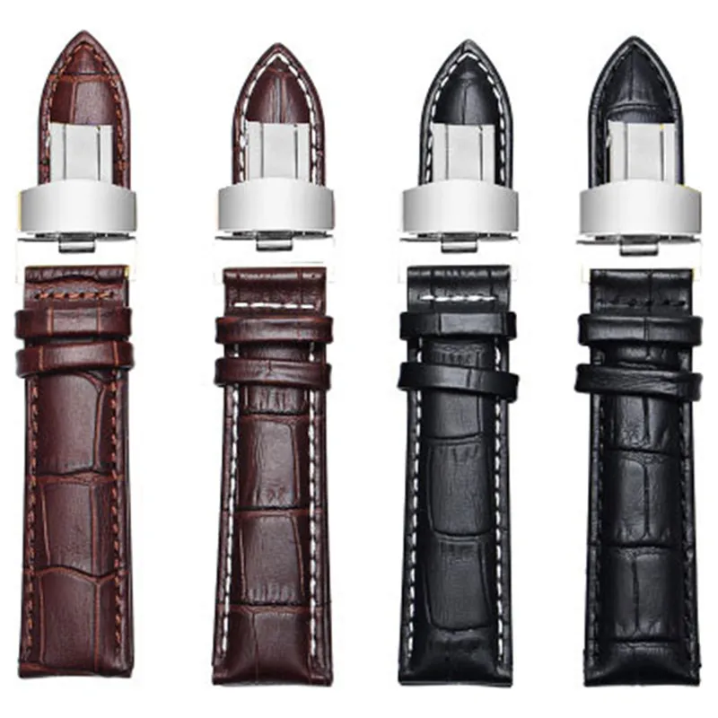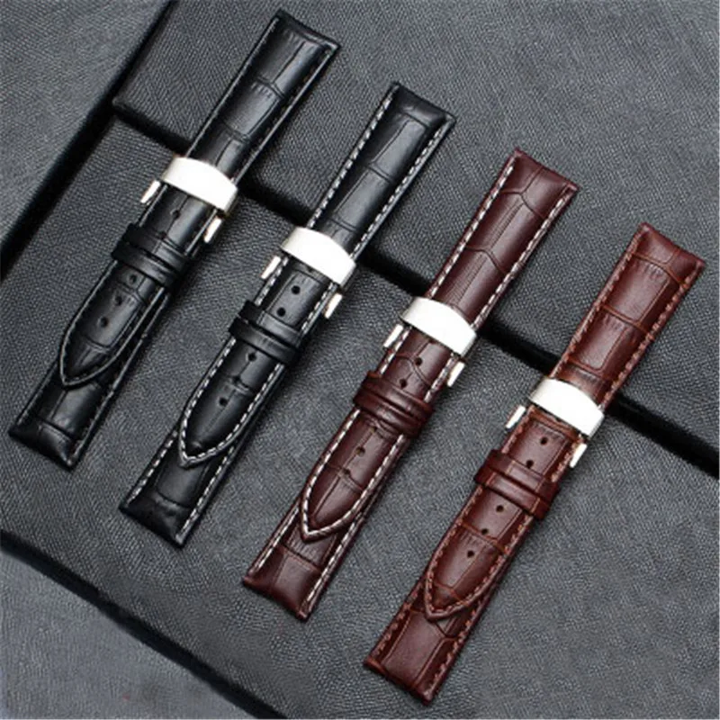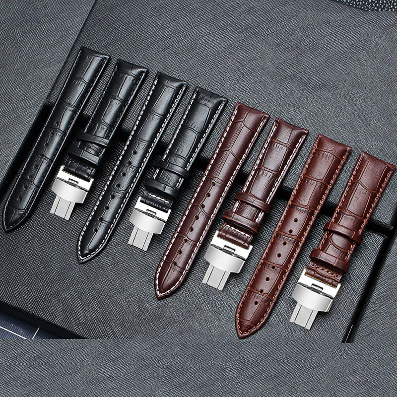 Ремешок из натуральной коровьей кожи для наручных часов 18-24 мм, брендовый полированный металлический браслет с раскладной пряжкой-бабочкой, Часовые аксессуары