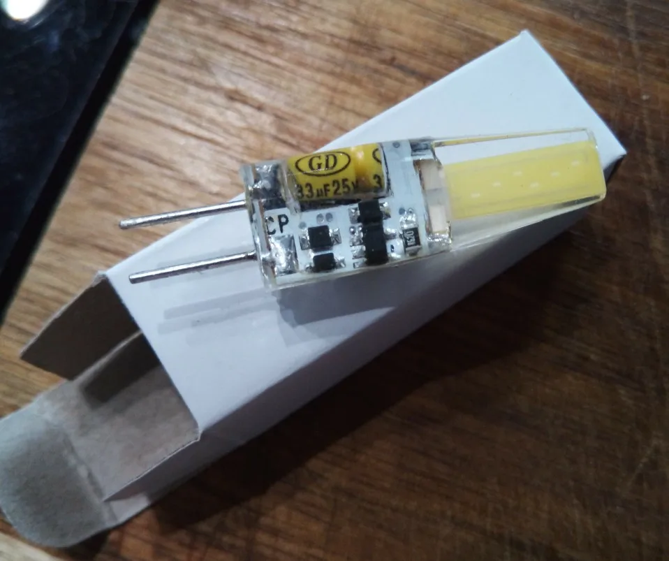 Покупал обычные 12 В DC лампы. Продавец отправил быстро, дошло до Ижевска за три недели. Лампа условно состоит из двух светодиодов, на каждый светодиод на входе стоят по два диода и по резистору на 51 Ом. По задумке производителя, если питание ламп 12 В и ограничительное сопротивление, которое стоит в лампе, 51 Ом, то мощность ламп должна быть действительно в районе 6 Вт (12 / 51 * 12 * 2 = 5,65). Это еще не учитывая падение напряжения на входных диодах. Но на деле по замерам вышло, что потребление лампы при 12 В питания не более 100 мА. Т.е. мощность лампы по факту выходит 12 В * 0,1 А = 1,2 Вт. Речи ни о каких 6 Вт даже близко нет. По яркости на свои 1,2 Вт светят неплохо, до этого стояли лампы фирмы ASD на 3 Вт. Если сравнивать с ними, то по яркости святят с ними почти наравне. Так что думаю своих денег стоят точно. Только не знаю сколько простоят, но греются не так сильно - это внушает надежду.
