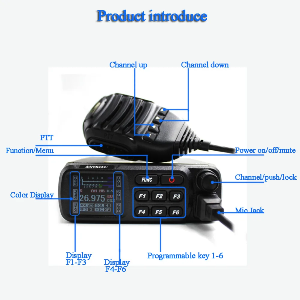 A-CB27 ОписаниеA-CB27-это мульти-нормы AM/FM citizen band мобильное радио, с красочным TFT ЖК-экраном, максимум 40 каналов, 6 программируемых клавиатуры с отображением на экране 6 функций, приносит вам новое ощущение визуального era.