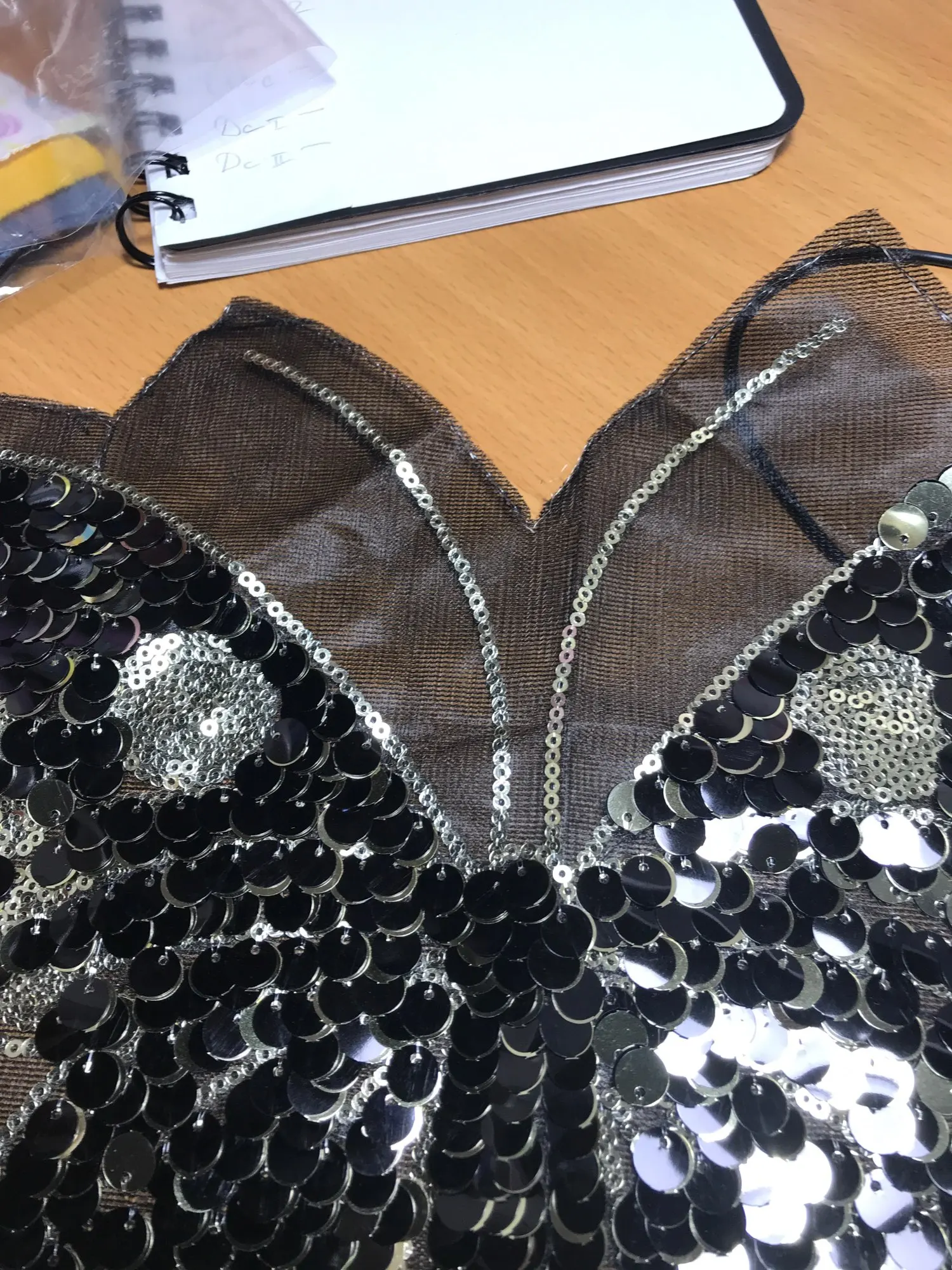 бабочка не плохая но на одном усике не хватает пайеток, а точнее 6 маленьких штучек в основании усика, придётся взять по 3 с каждого края усика и подставить там где недостаёт.
