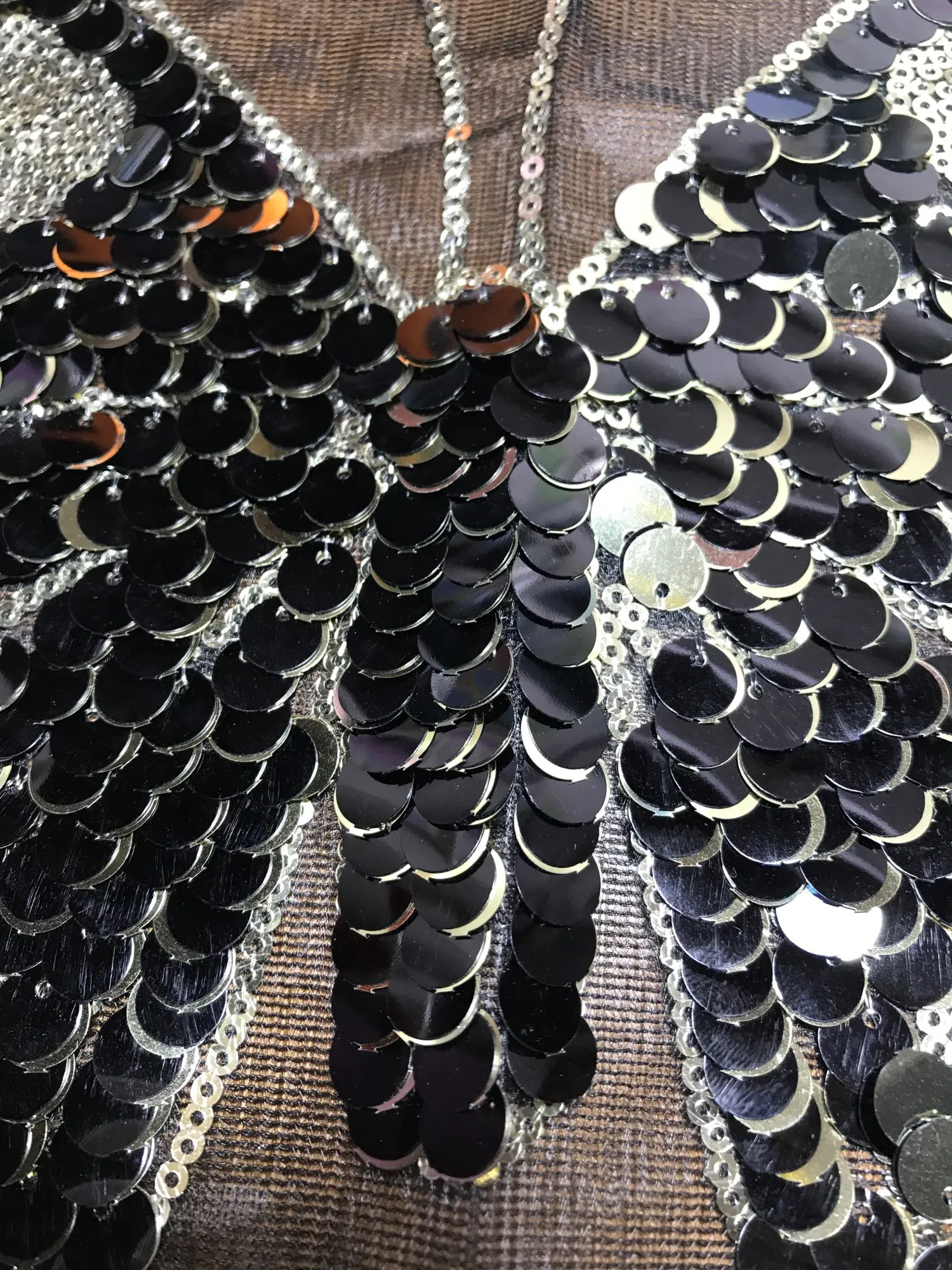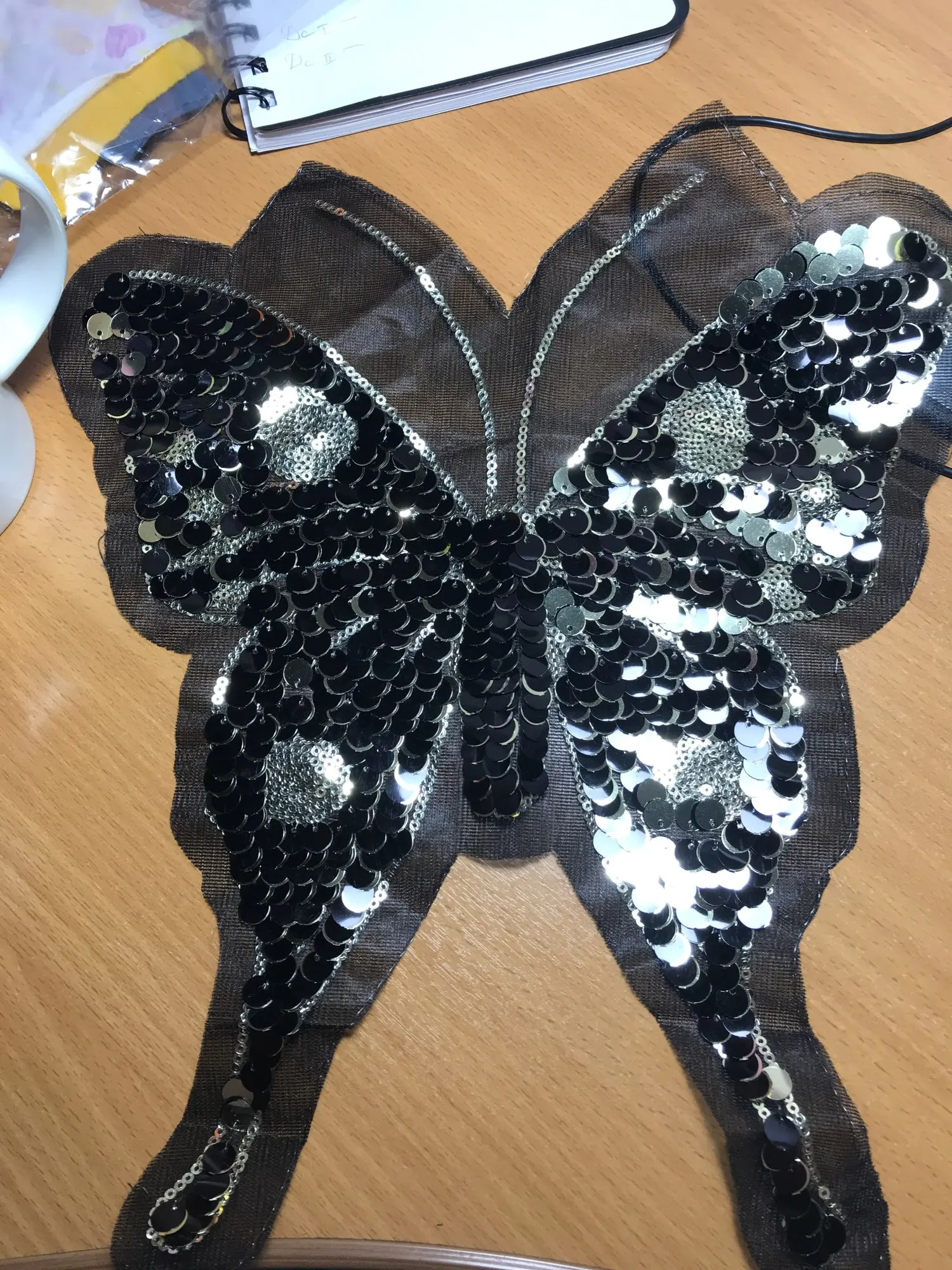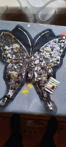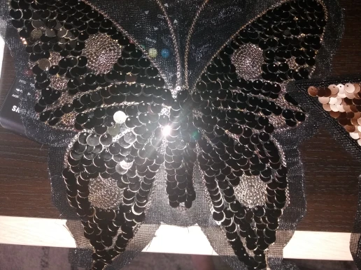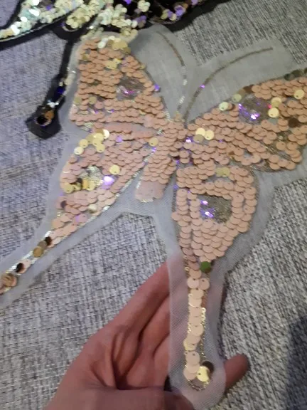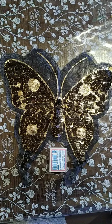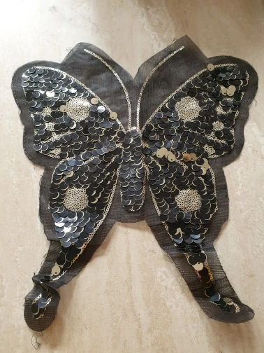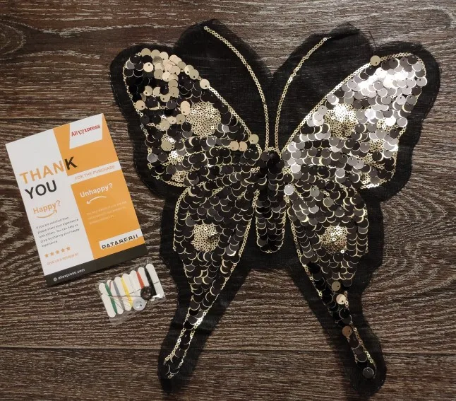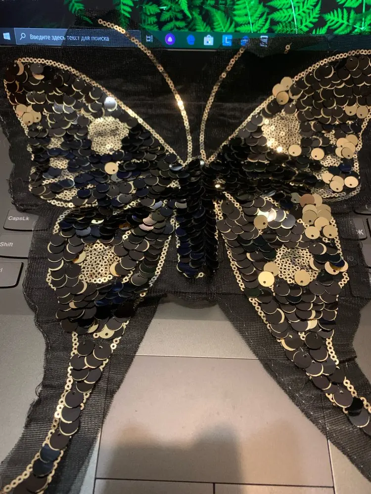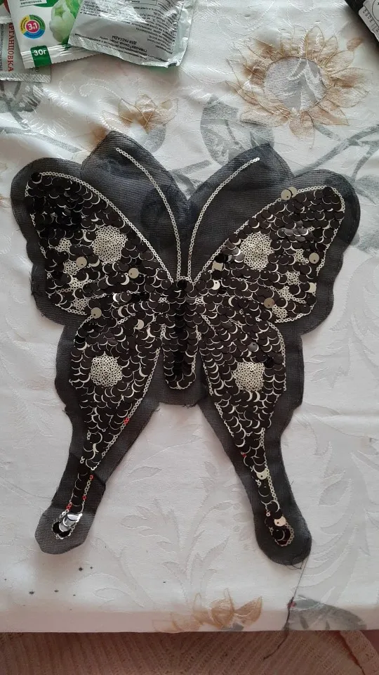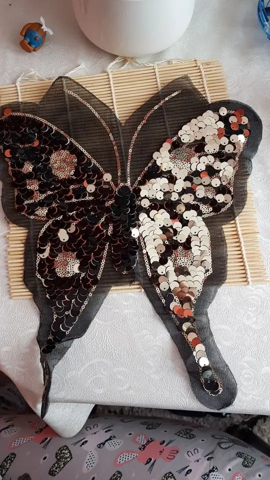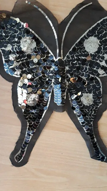 Красивая, большая бабочка, пайетки можно развернуть на обратную сторону, цвет поменять на золотистый, цвет на фото правда немного отличается от реального. Заказ пришёл по ускоренной доставке за 3 недели.