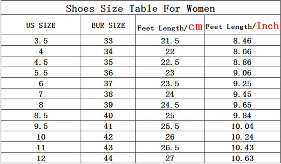 Как подобрать правильный размер? Это не стандартный американский размер Пожалуйста, выберите размер в соответствии с вашим Европейским размером, длиной стопы или внутренней длиной обуви.Мы отправляем товар в соответствии с европейскими размерами или длиной стопы. Например: Если вы выберете американский размер 4,5, мы вышлем вам европейский размер 35, он поставляется с длиной стельки 22,5 см. Возможно отклонение на 0,5-1 дюйм из-за ручного измерения (1 дюйм = 2,54 см)