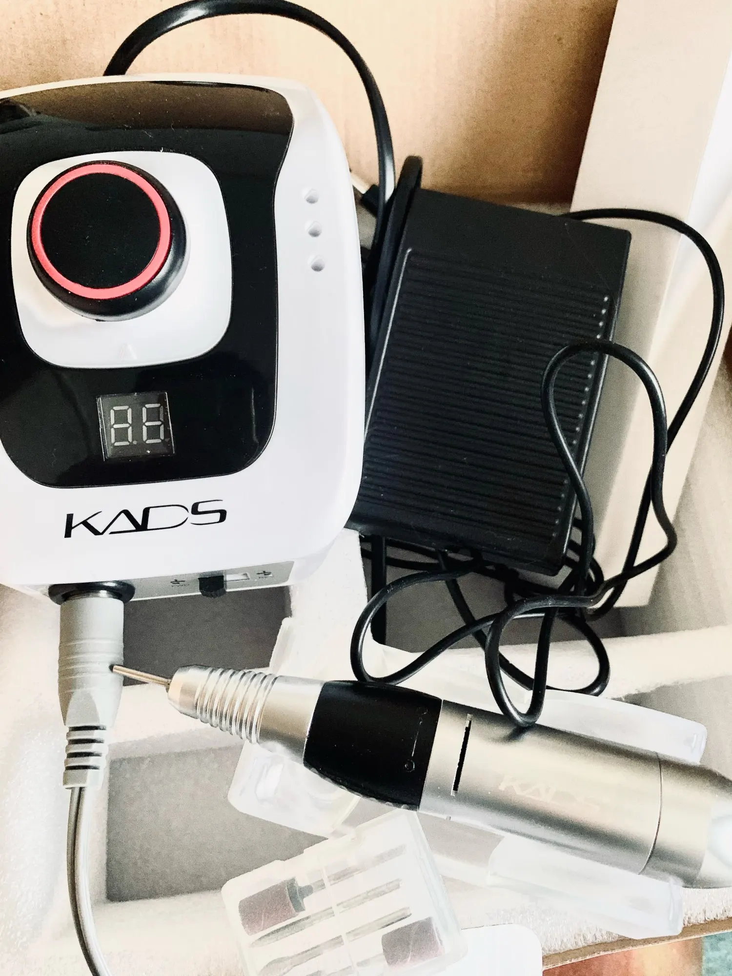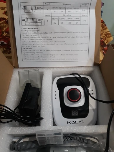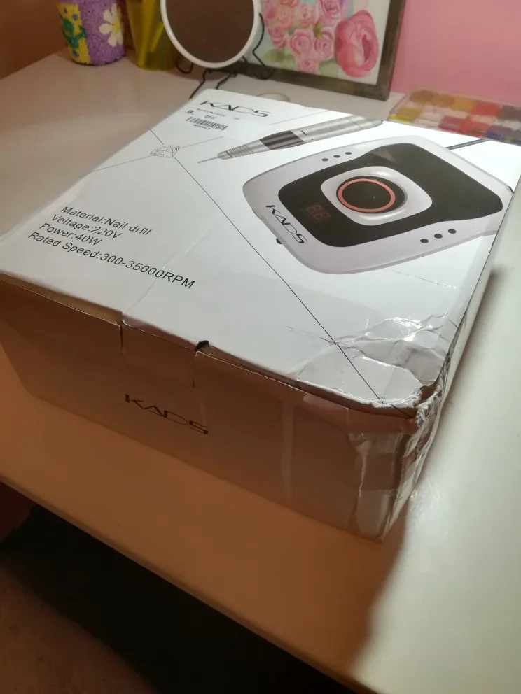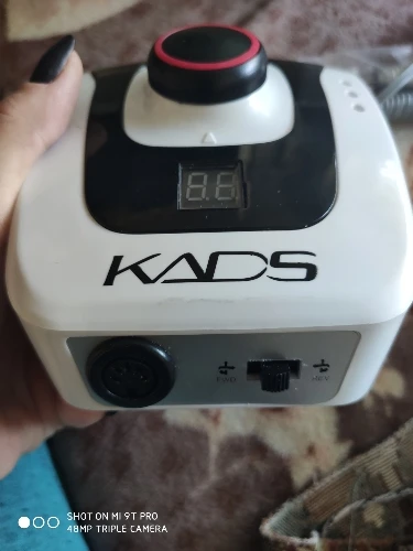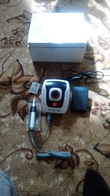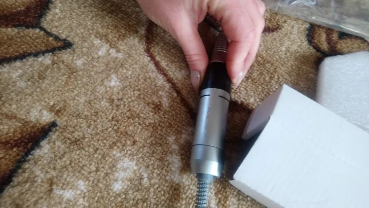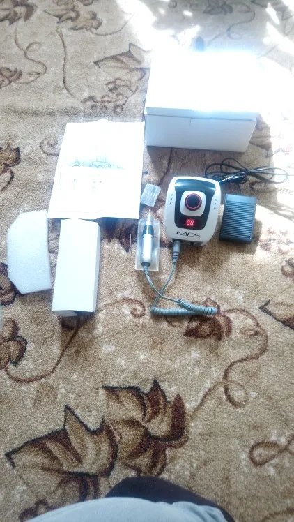 Курьер привез аппарат к дверям квартиры через день после заказа. Это самая быстрая доставка с Али! Был упакован в коробку, но не брендированную, все детали в пакетиках разложены, есть инструкция, но читать там нечего т.к. аппарат стандартный, у меня похожий уже был просто захотелось дисплей и оборотов побольше. В работе уже проверила, все ок. Из особенностей - удивила неожиданно тяжелая ручка и из нее слегка дует! В старом аппарате при полном внешнем сходстве ручка была легенькая и щели чисто декоративные. Теперь я понимаю что значит ручка с охлаждением. Фрезы у меня свои в ассортименте, но ради интереса попробовала пару тех, что прилагались к аппарату. На удивление оказались рабочими, по жесткости похожи на красную полоску.