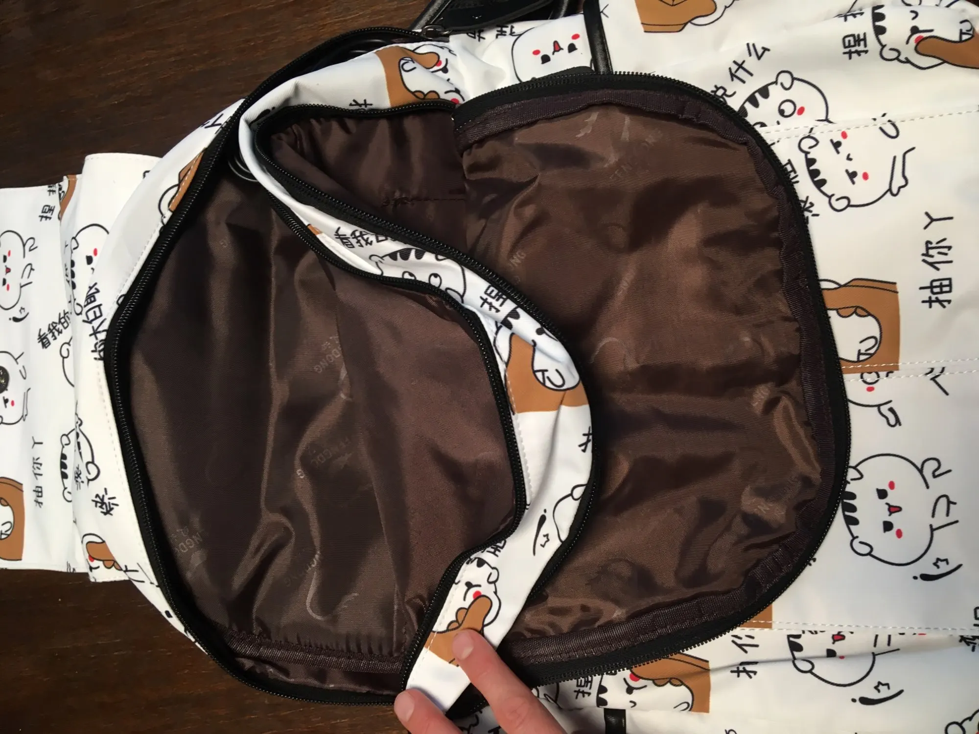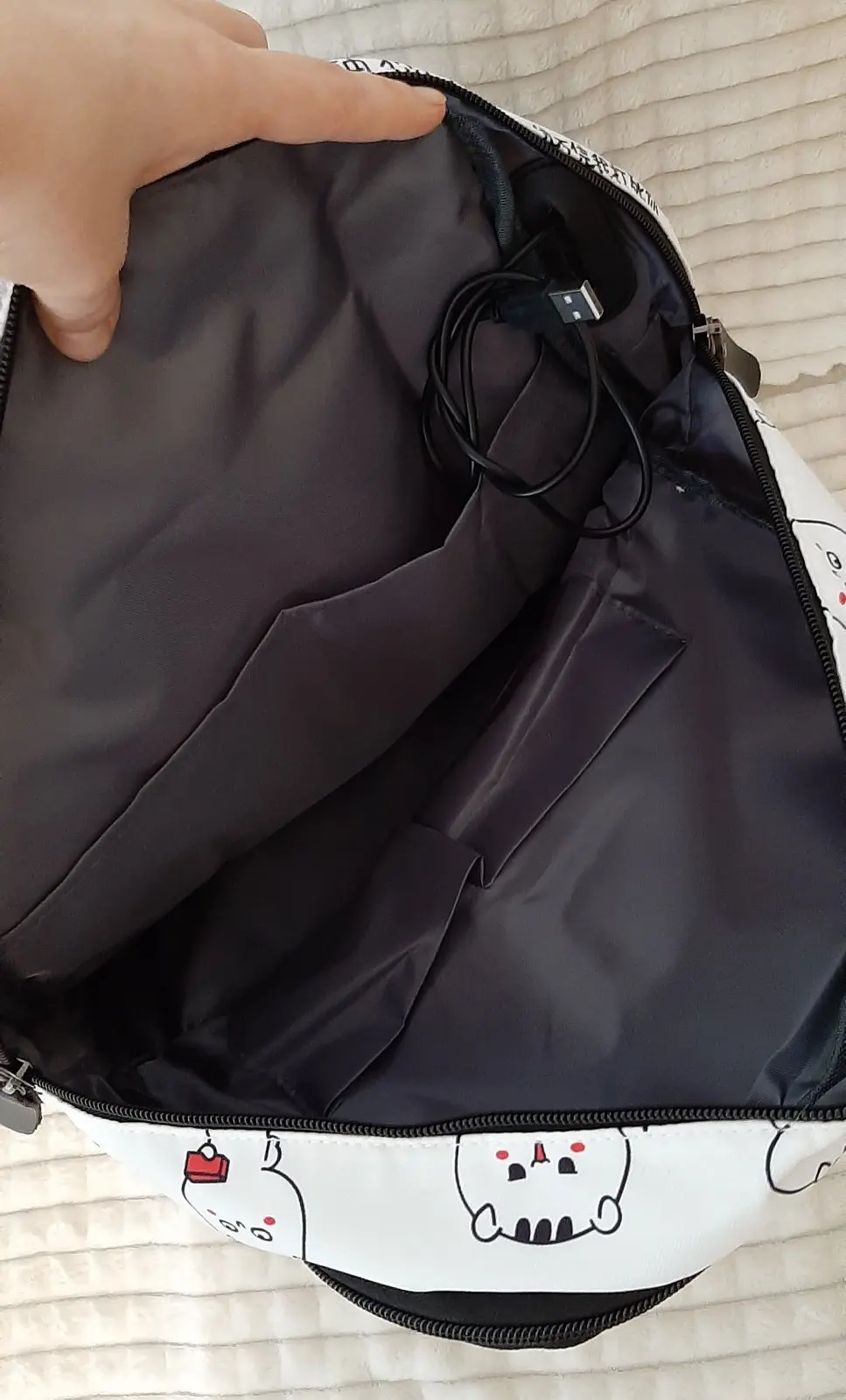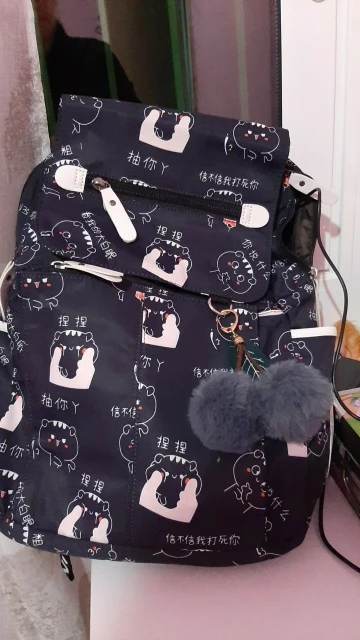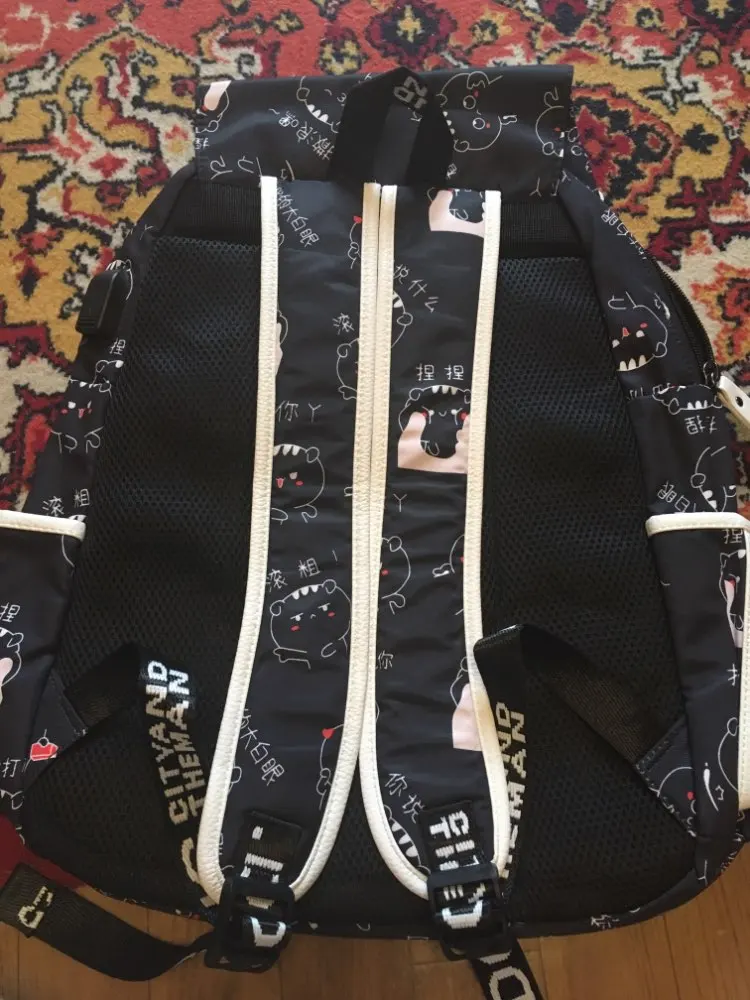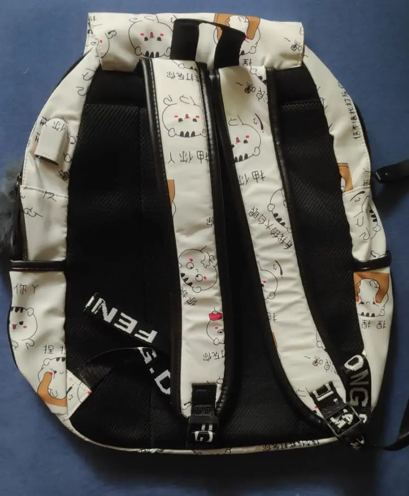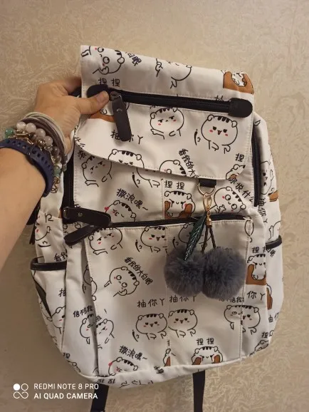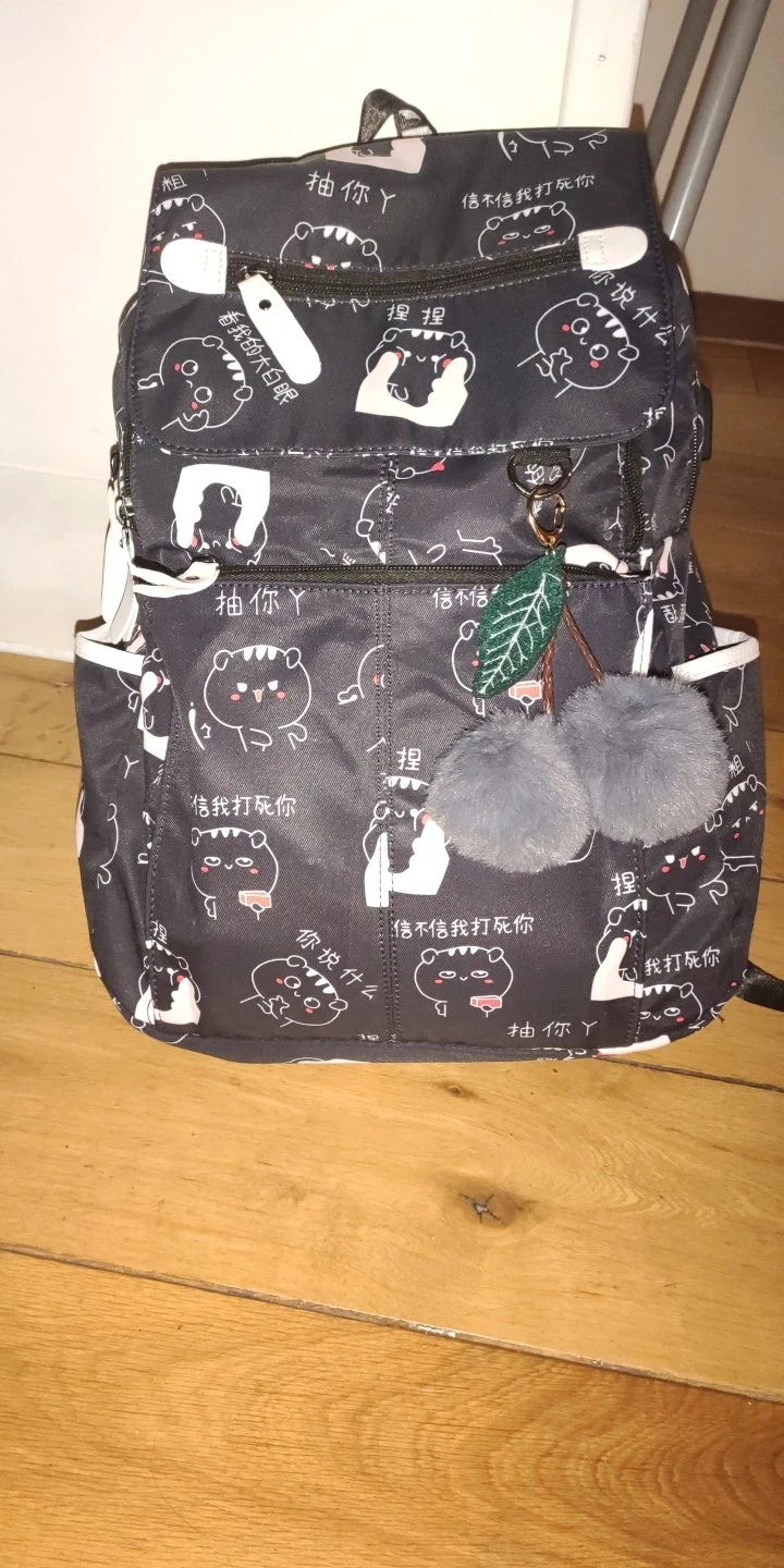 Рюкзак отличный, описанию полностью соответствует. Вместительность добротная, даже ноутбук спокойно поместился, хотя думала, что из-за формы трапеции (выше чуть сужается) такая немаленькая вещь не влезет. Материал пахнет, но должен быстро выветриться, внутренности рюкзака (кармашки) несколько неприятно шуршат, но не критично. Брелок мягкий, приятный. Принт четкий, воду рюкзак не пропускает. USB провод (довольно длинный, к слову) подложен в отдельный маленький кармашек на молнии. Из минусов могу выделить маленькие боковые карманы: не каждая бутылка или термос в них влезет. Также, на мой вкус, коротковаты лямки: на максимальной длине мне, человеку ростом 180+ см, до бедра не достает, непривычно. С продавцом не общалась, заказ отправили очень быстро, через IML пришел за 3 дня (Москва). Общее впечатление крайне положительно, советую!♡