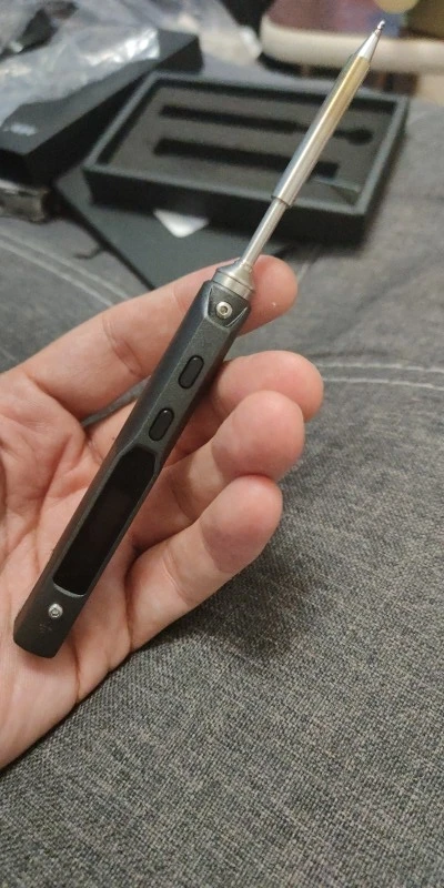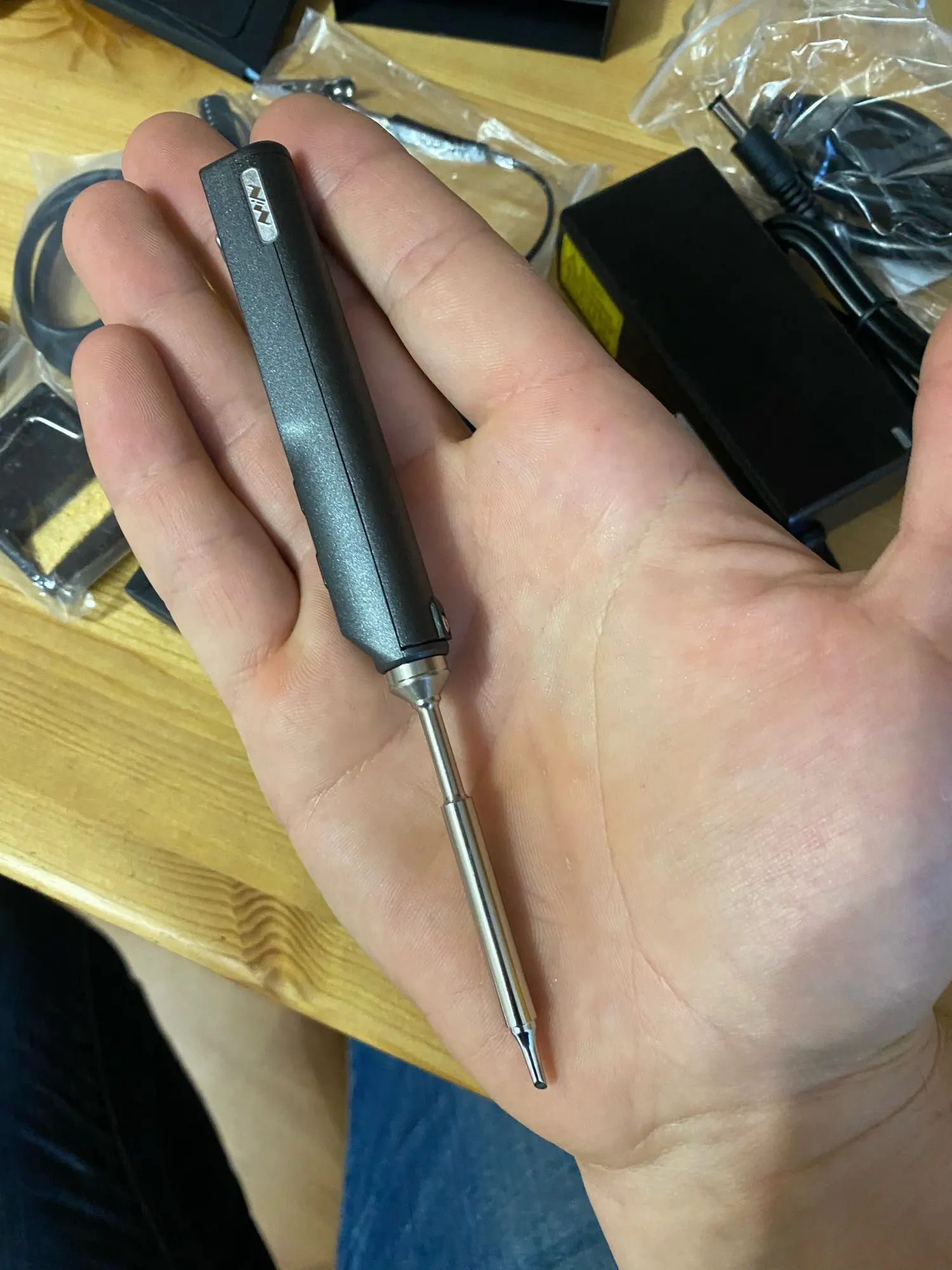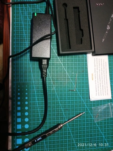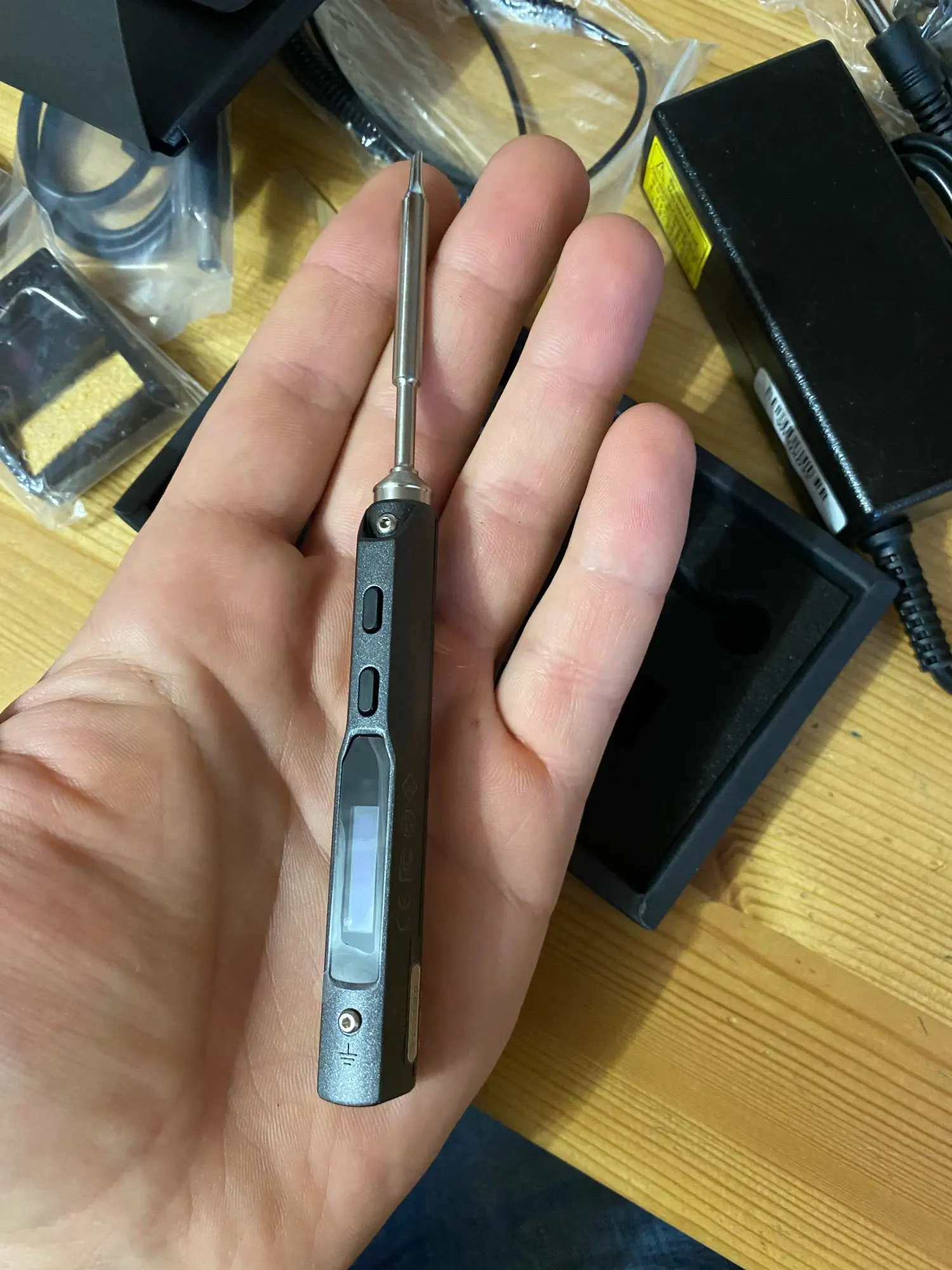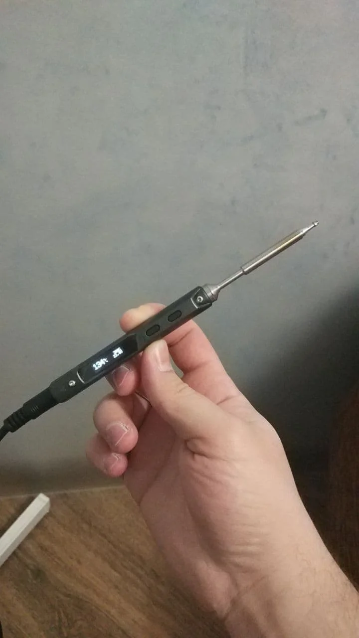 Кхм, он пришёл и он прекрасен Такое не грех подарить кому-нибудь, настолько презентабельно выглядит коробочка паяльника, но нет, это моё Как и заявлено в инструкции и видео паяльник нагревается и готов к работе ровно через 11 секунд, благо у этого продавца нет обмана в плане блока питания, он здесь как надо 24 вольта, поэтому-то паяльник работает на полную 64 ватта, а не в половину как Я видел в отзывах у других продавцов Подставка символичная удобная, шнур паяльника достаточно длинный и очень эластичный от того и удобный при пайке, блок питания не занимает много места, сам паяльник очень удобно лежит в руке (как ручка) пластик рядом с жалом не греется, кнопки удобные, паяльник можно (насколько Я знаю) перепрошить на русский язык В общем, сказать что Я просто доволен приобретением это ничего не сказать, Я в восторге