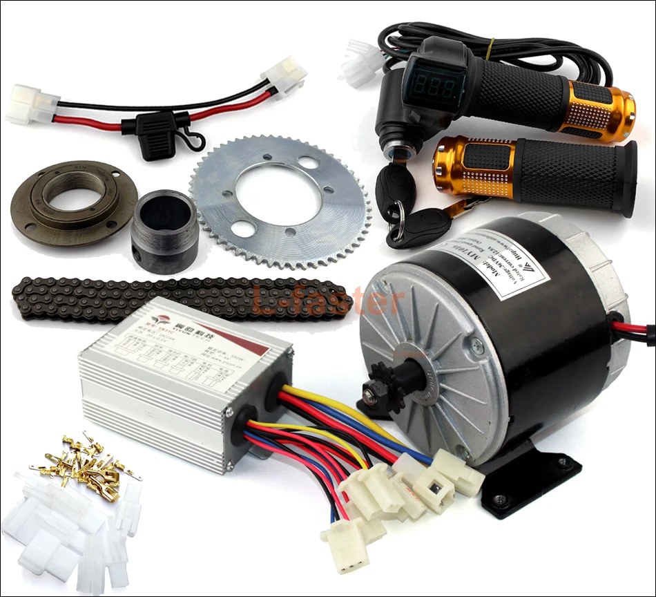 1). 1 х 350 Вт Мотор щетки2). 1 х контроллер двигателя (с проводом предохранителя)3). 1 х дроссельная заслонка(С индикатором заряда батареи и кнопочным выключателем)4). 1 x беззубное свободное колесо5). 1 x цепное колесо (55 зубьев)6). 1x25H цепь (106 звеньев)7). 1 x адаптер свободного колеса (27 мм)