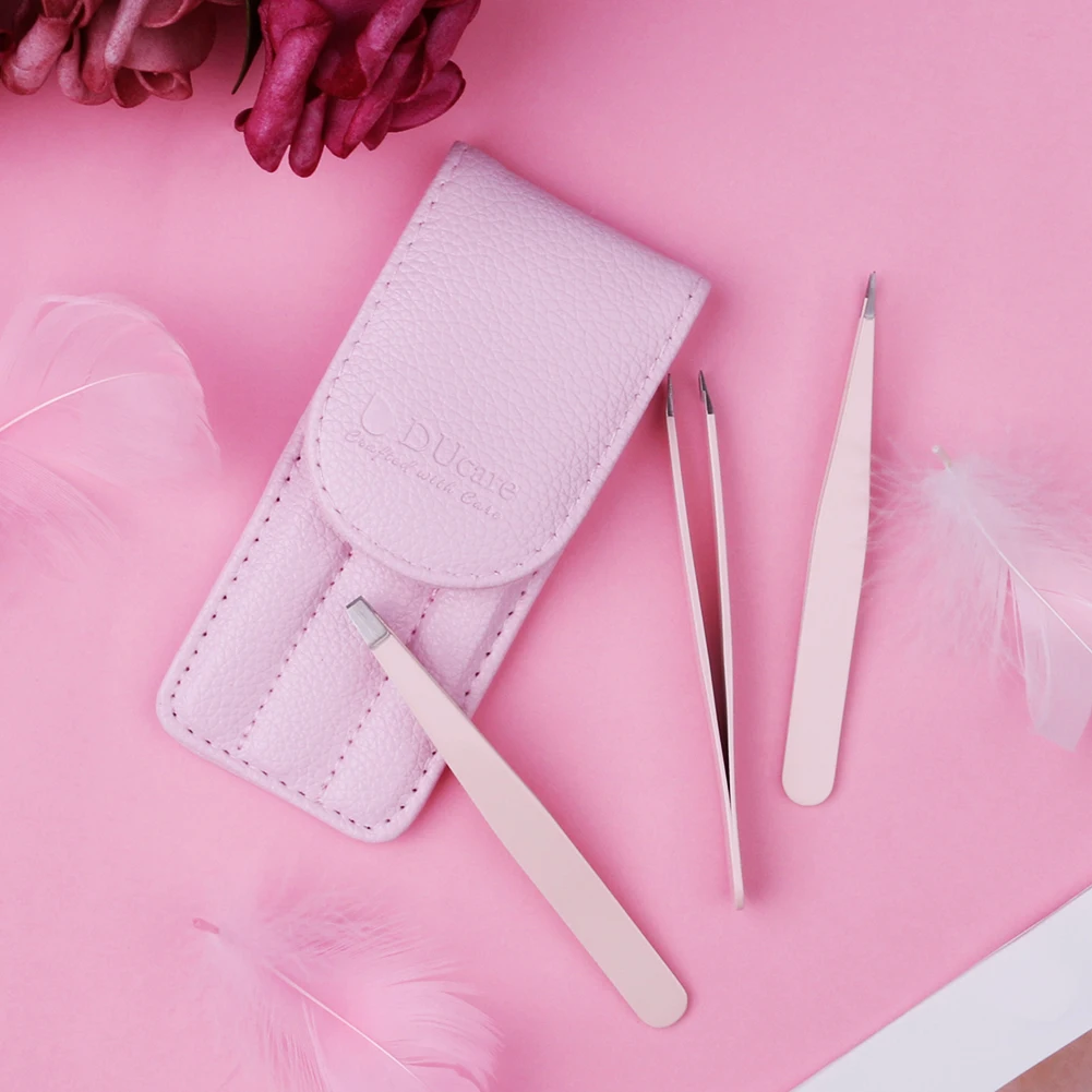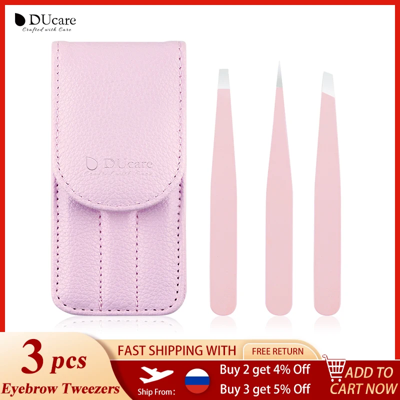 Набор пинцетов для бровей DUcare, 3 шт., плоский наконечник из нержавеющей сталиНаклонный наконечникзаостренный наконечник, пинцет для удаления волос с глаз в розовой сумке