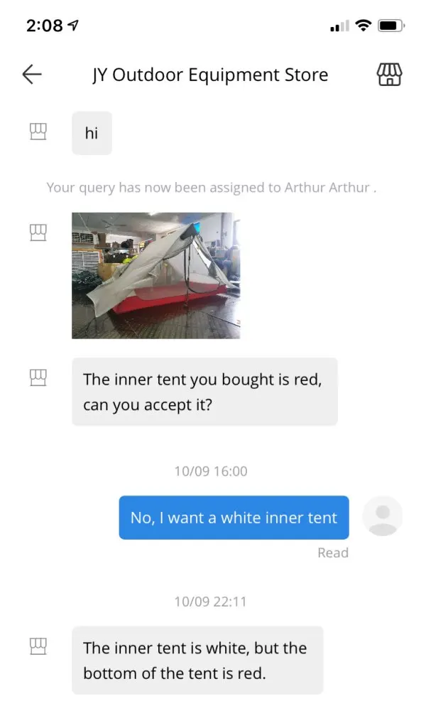 Я получил эту палатку не того цвета/модели, я был разочарован. Продавец сумел решить мой вопрос и легко вернуть товар, но весь процесс оставляет желать лучшего. Сначала я попробовал отправить мне не тот цвет внутренней палатки, который я не сказал, а затем прислал совершенно другой цвет как для внешней палатки, так и для внутренней палатки. Это было просто пустая трата времени на то, чтобы справиться с процессом возврата, когда они четко не имеют нужной палатки в наличии на первом месте. Теперь мне нужно потратить еще больше времени, ожидая возврата своих денег и даже больше времени, чтобы заказать другую палатку.