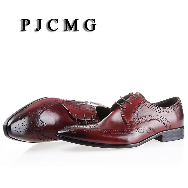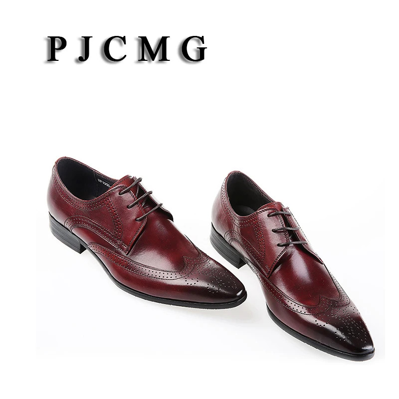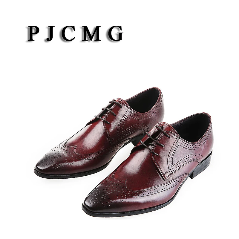 Мужские туфли-оксфорды PJCMG, черныекрасныекоричневые туфли с острым носком, из натуральной кожи, для офиса
