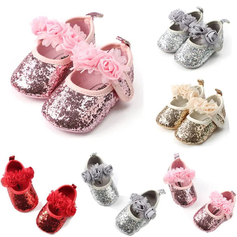 Новинка 2018, модная повседневная Милая обувь, мягкая однотонная обувь для кроватки для маленьких девочек с блестками и цветами, с крючками, 4 стиля, наряд на 0-18 месяцев