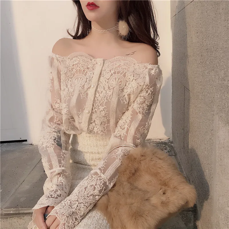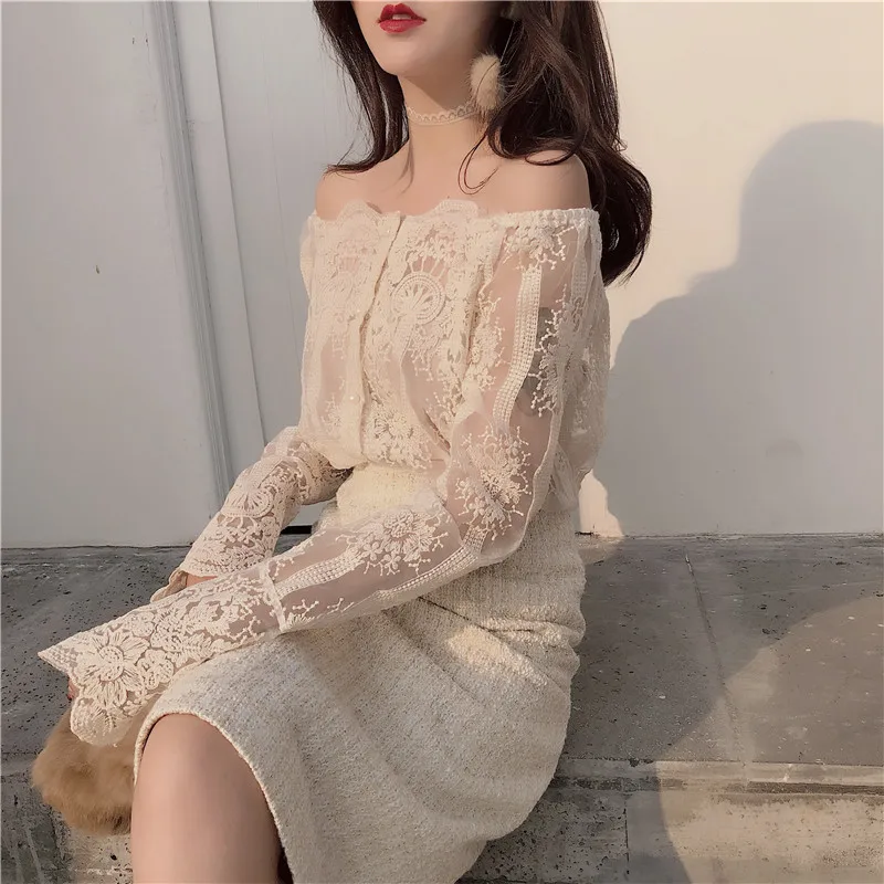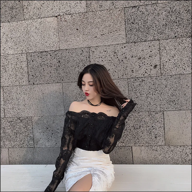 Пуловер женский кружевной, без бретелек, с длинным рукавом, узкая блуза-рубашка