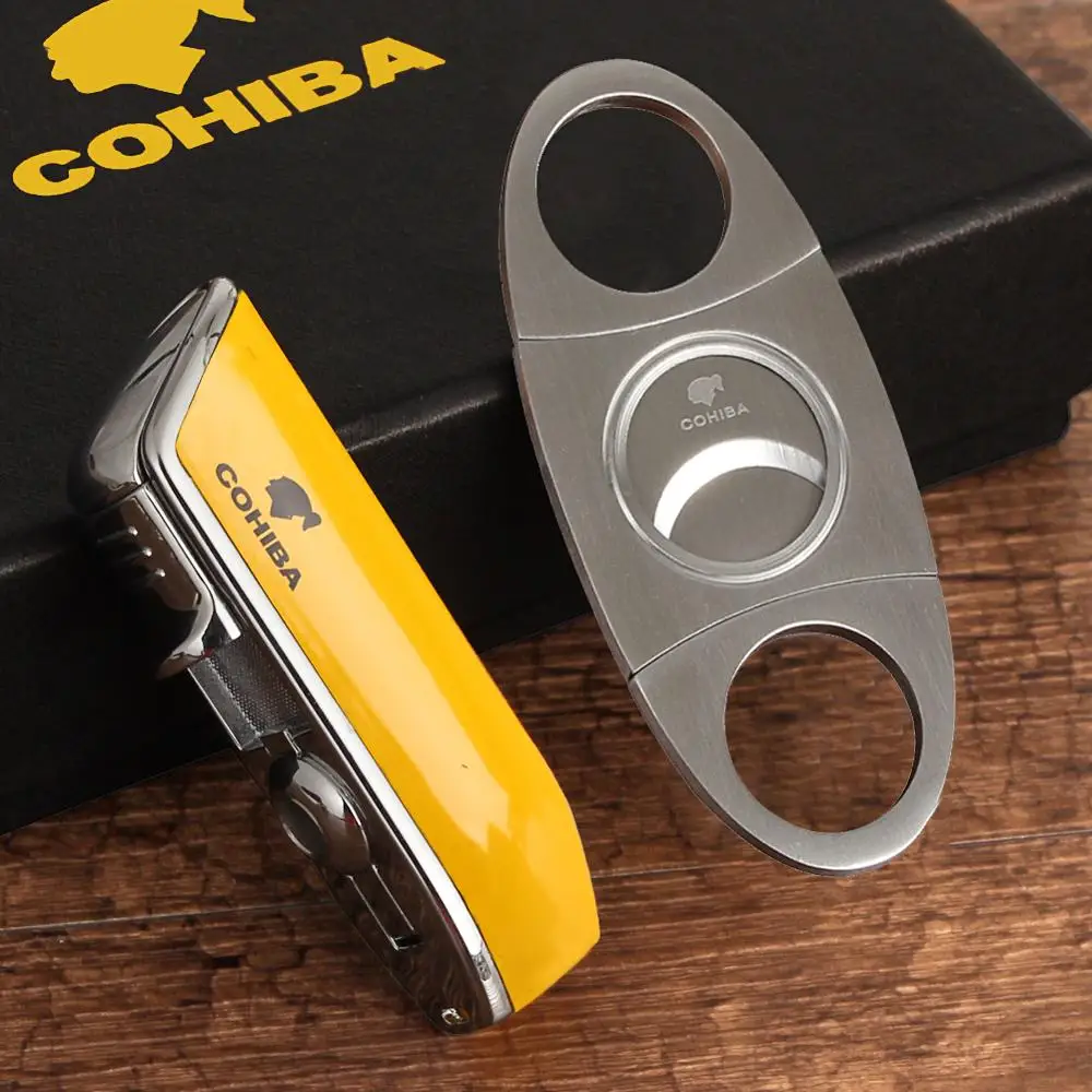 Металлическая ветрозащитная Зажигалка COHIBA, острый сигарный нож из нержавеющей стали с 3 струями пламени и газа для сигар, набор аксессуаров для сигар