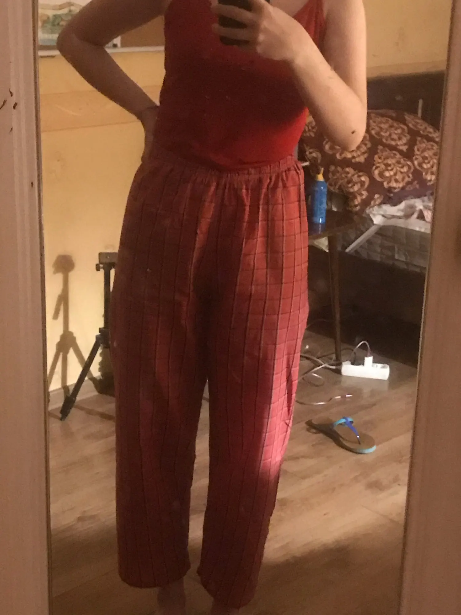 нормальные штаны, только очень тонкие, совсем тряпочка. на лето по дому гонять самое то. жаль, что нет карманов, с ними было бы удобнее. хотя за такие деньги оно и понятно, и на том спасибо)