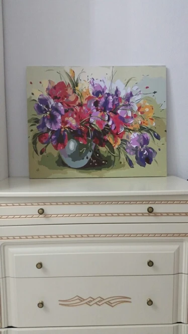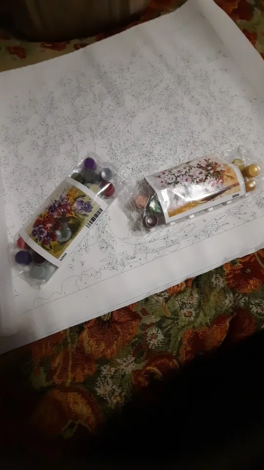 Доставка быстрая с отслеживанием до почтового отделения в Сочи. Упаковано хорошо. Намотка на валик. Холст пропечатан и цифры видно разборчиво. Краска свежая и закрашивает цифры. Ничего не протекло. У меня в заказе размер 65х70 и прислали двойной набор красок и кисточек. красок хватило. Картиной довольна. Результат на моих фото.