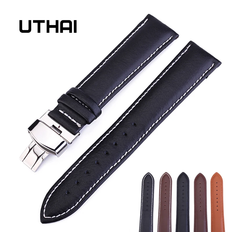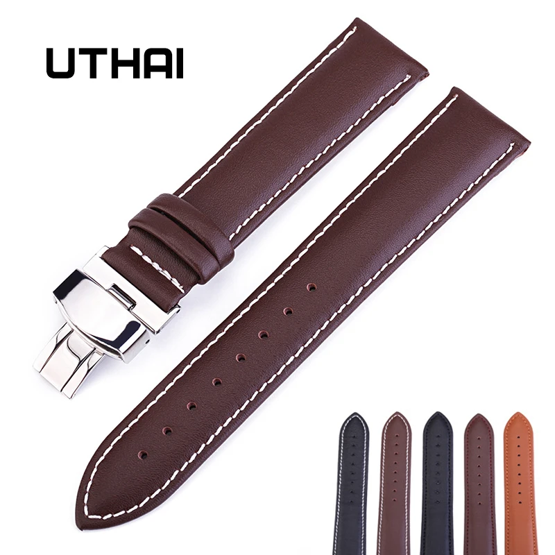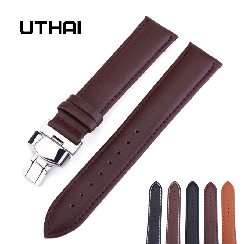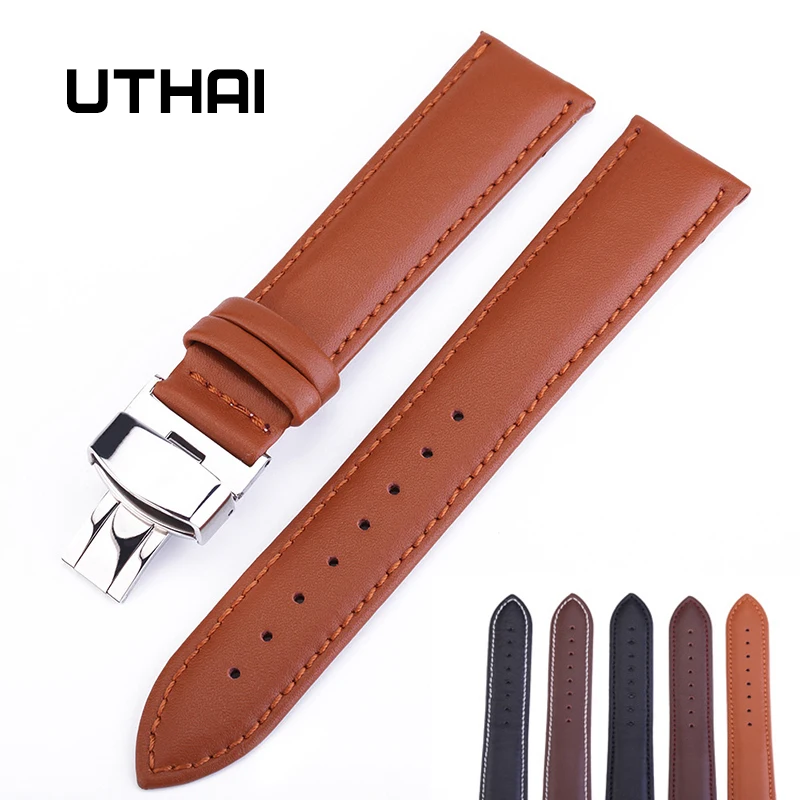 Ремешок UTHAI Z07 из натуральной кожи с пряжкой-бабочкой, аксессуары для часов, Высококачественный коричневый браслет для наручных часов, 12-24 мм