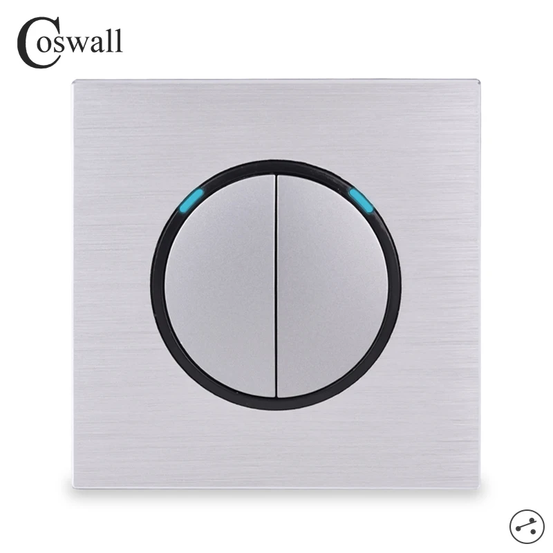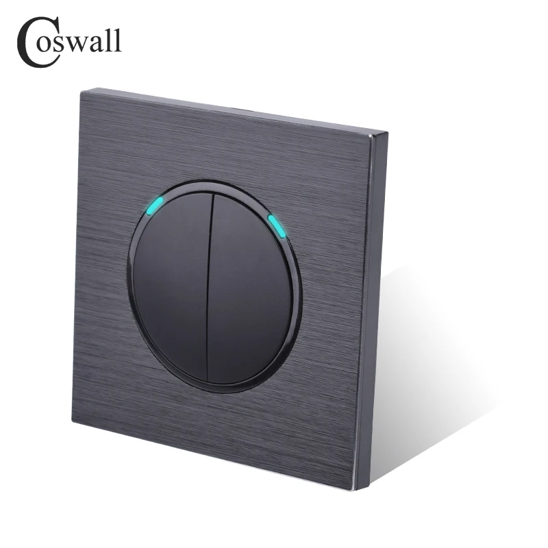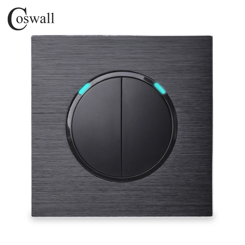 Выключатель Coswall, 2 клавиши, двухсторонний, со светодиодным индикатором, ЧернаяСеребристаясерая алюминиевая панель