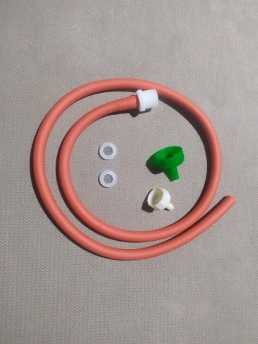 Пришло довольно быстро, комплектность порадовала: кроме всех переходников (у зелёного обломан конец, но я понятия не имею, накой он) и фильтров есть ещё и маленькие пакетики лубриканта. Из минусов - шланг довольно тонкий и жёсткий: может не справиться с поворотами внутри и просто закрутиться где-то, но это надо проверять. Конец не литой, а вырезаный, хоть и довольно ровно, но есть острый угол.