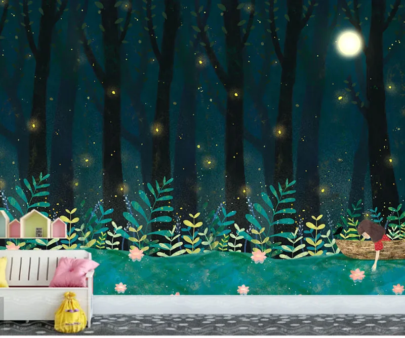 Ручная роспись ночных пейзажей, лес, светящаяся луна, 3d Мультяшные обои, фрески для детской комнаты