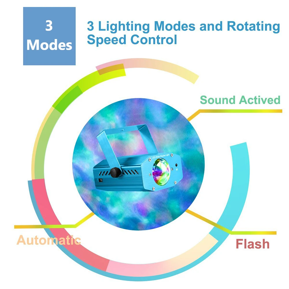 Разноцветный дисплей:7 цветов водных волн светильник, Выбирая отдельные цвета или сочетания цветов с помощью пульта дистанционного управления, проектируя красочный светильник на потолок, стену и пол, создавая романтическую и расслабляющую атмосферу