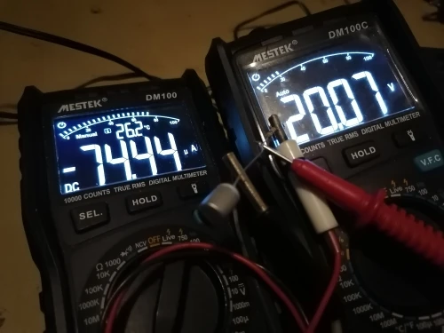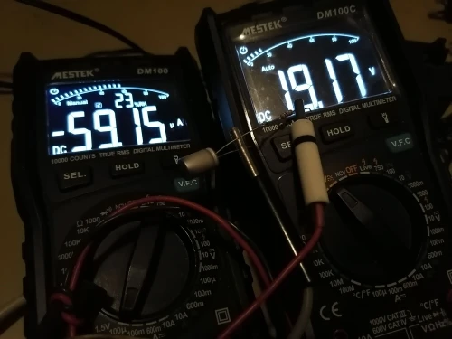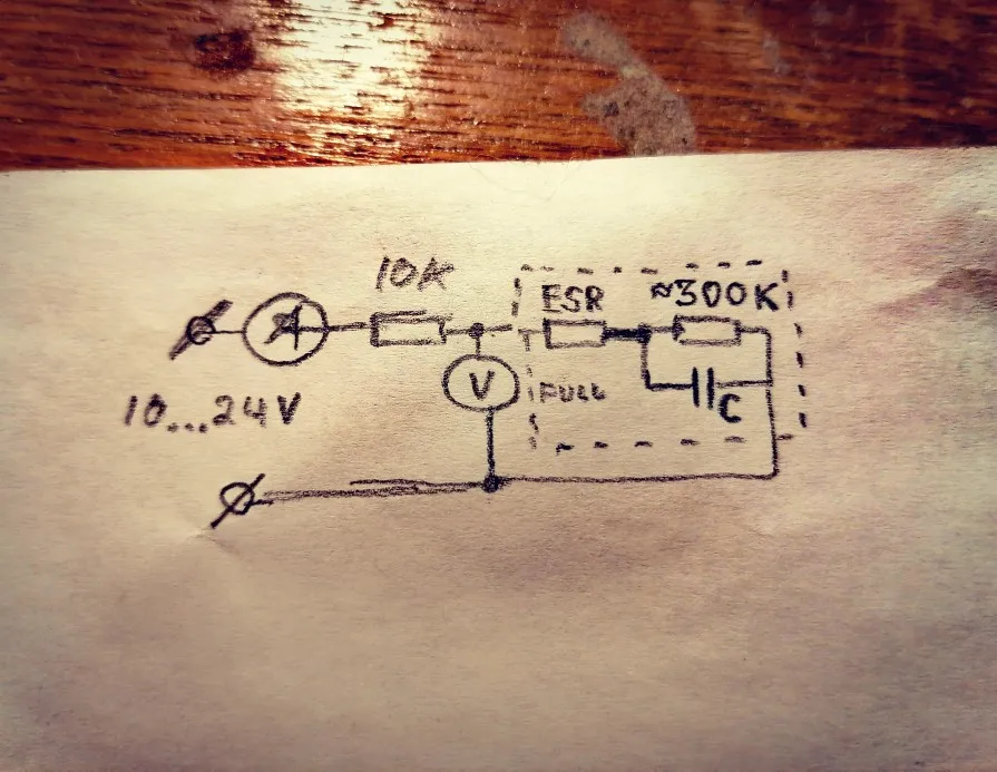 Конденсаторы довольно хорошие. Имею право утверждать это, основываясь на полученной мною партии. Указанным параметрам соответствуют, хотя и с разбросом (2 конденсатора были на ~470uF, остальные около 500, но я и на оригинальных полимерниках часто встречаю завышенную ёмкость). У всех конденсаторов сверхнизкий ESR (меньше половины цены деления тестера деталей). Внутренняя утечка у них соответствует полимерникам (Vloss в пределах 1–3), с утречкой более 2.5% было только 3 детали из партии. Для проверки внутреннего сопротивления диэлектрика (Rд) и высокого напряжения (Vном+20%) взял конденсатор с наибольшим Vloss 3.3%. Схема стенда приложена. По результатам испытаний, Rд≈300K и более. Напряжение выше 20V на конденсаторе поднимать не стал (это уже 125%Vном), поскольку даже оригинальные, брендовые конденсаторы имеют заявленный запас по максимальному напряжению всего +20% (в нашем случае это 16V*125%=19.2V). По качеству исполнения, цвет маркировки фиолетовый, качество типографии не высокое.