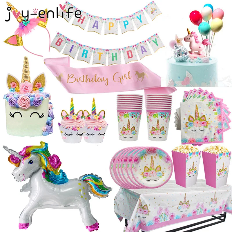 Вечерние товары для девочек с единорогом, розовый Радужный баннер единорог, тарелка, шар, салфетка, обертка для кекса, детский душ, украшение на день рождения