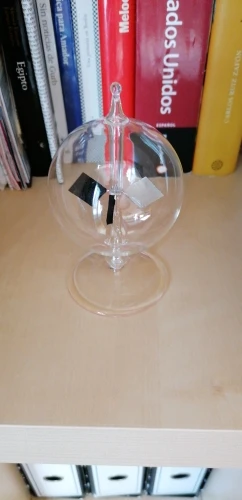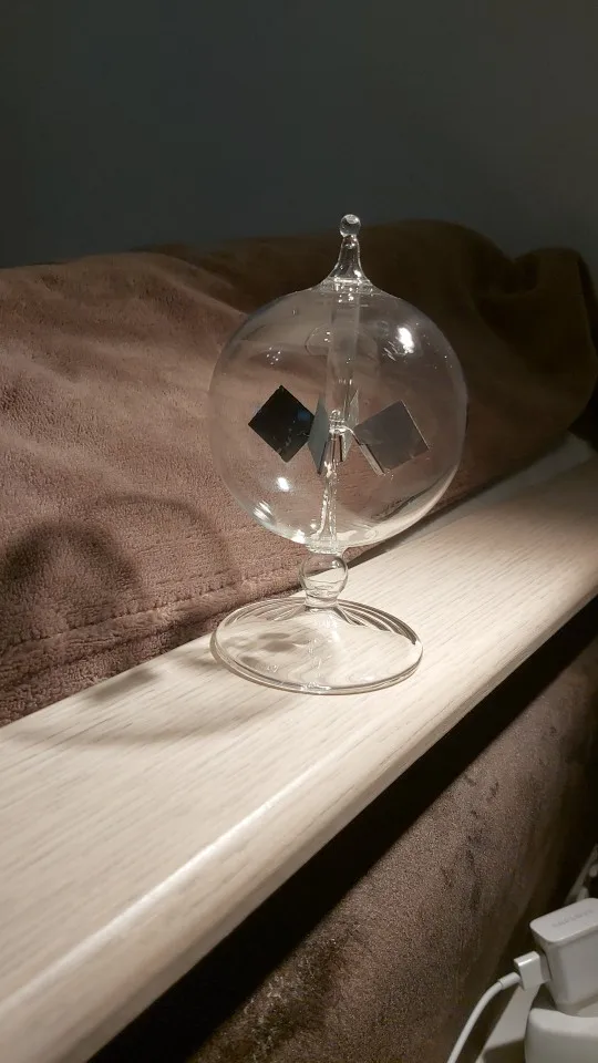 Он прибыл в целости и сохранности, и он работает, но чувствительность немного низка-Он поворачивается не очень быстро, когда я блестю, мой фонарик 18W увеличился на нем, И он не вращается, когда помещается прямо под светодиодную лампу 5 Вт или у окна, хотя в последнее время он не был солнечным. В солнечный день он должен быть в состоянии вращаться, просто не ожидайте, что он будет работать при искусственном освещении нормальной яркости или в пасмурные дни. Он также может быть сделан для вращения с помощью плазменного шара, показывающего поток ионов, просто прикоснитесь к плазменному шару с одной стороны лампы радиометра (с радиометром, стоящим на непроводящем столе) и прикоснитесь к другой стороне лампы радиометра пальцами (Так что ток проходит через ротор и окружающий газ). Газ внутри радиометра будет тускло светиться голубоватым фиолетовым, и лопасти будут поворачиваться даже без света.