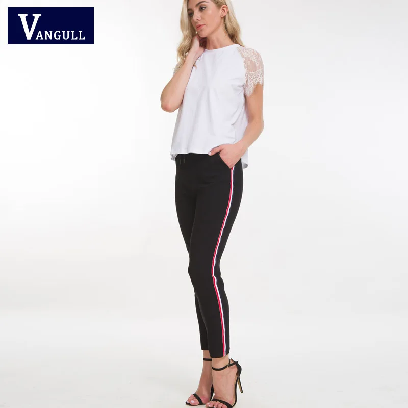 Женские облегающие брюки Vangull, хлопковые брюки-карандаш в полоску с завышенной талией и карманами на шнурке, черные повседневные брюки на осень