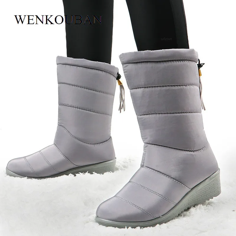 Женские зимние сапоги, водонепроницаемые сапоги до середины икры, меховые сапоги на танкетке, женские теплые сапоги на пуху, сапоги на платформе 2020