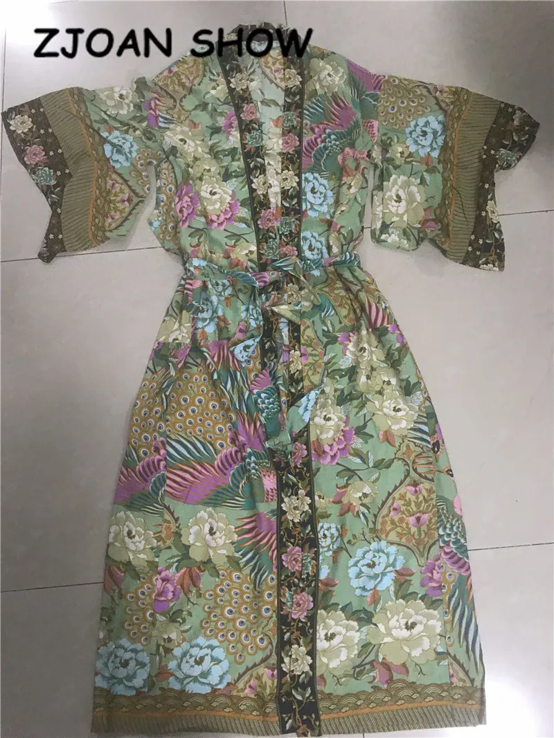Женское кимоно, длинная рубашка с цветочным принтом павлина, V-образным вырезом, в этническом стиле, на завязках, с поясом, Свободный кардиган