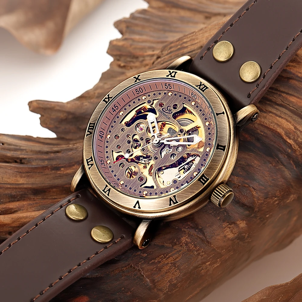 Часы SHENHUA мужские наручные в стиле стимпанк, повседневные автоматические, с бронзовым ремешком, в стиле ретро, 2018