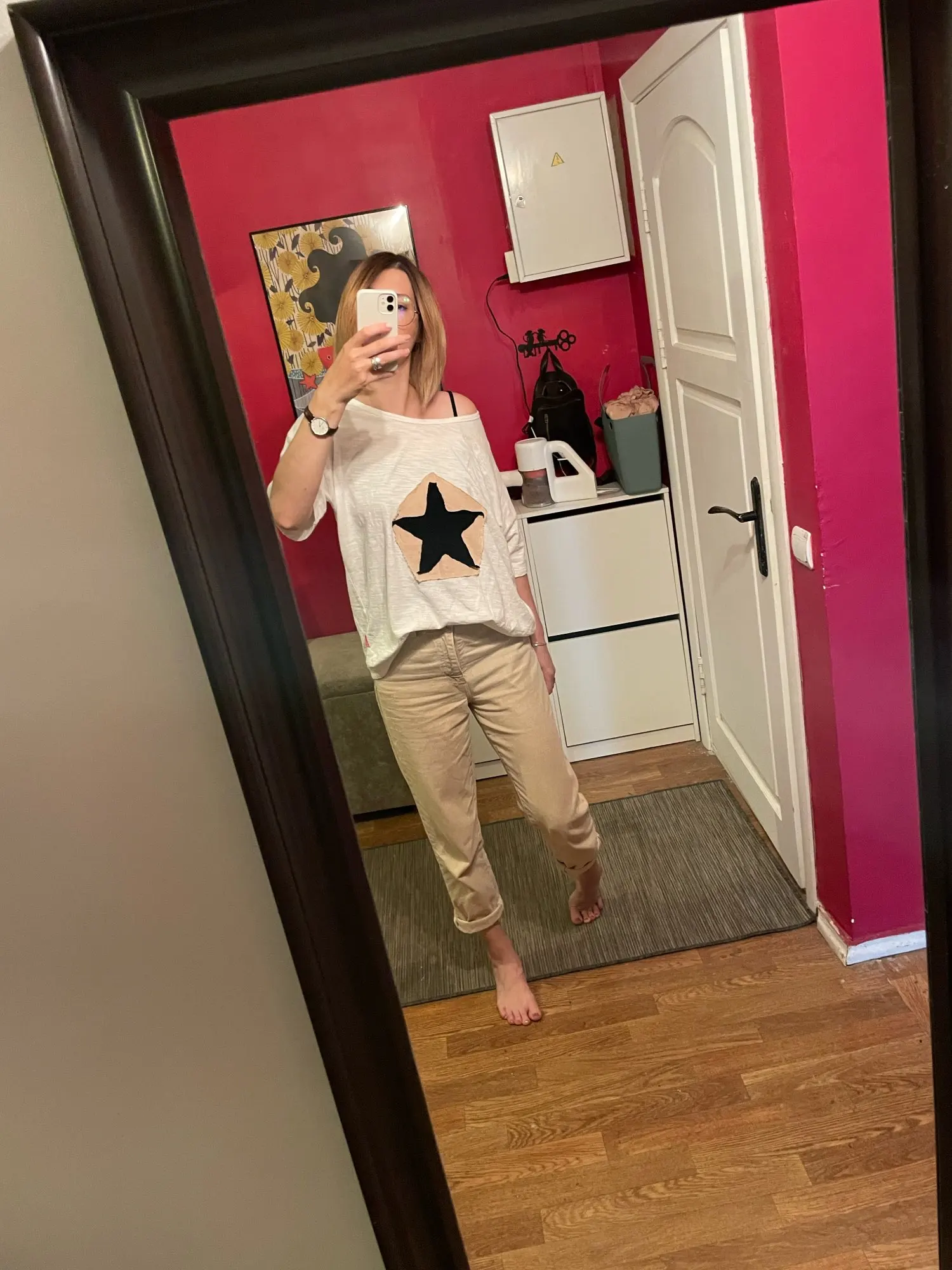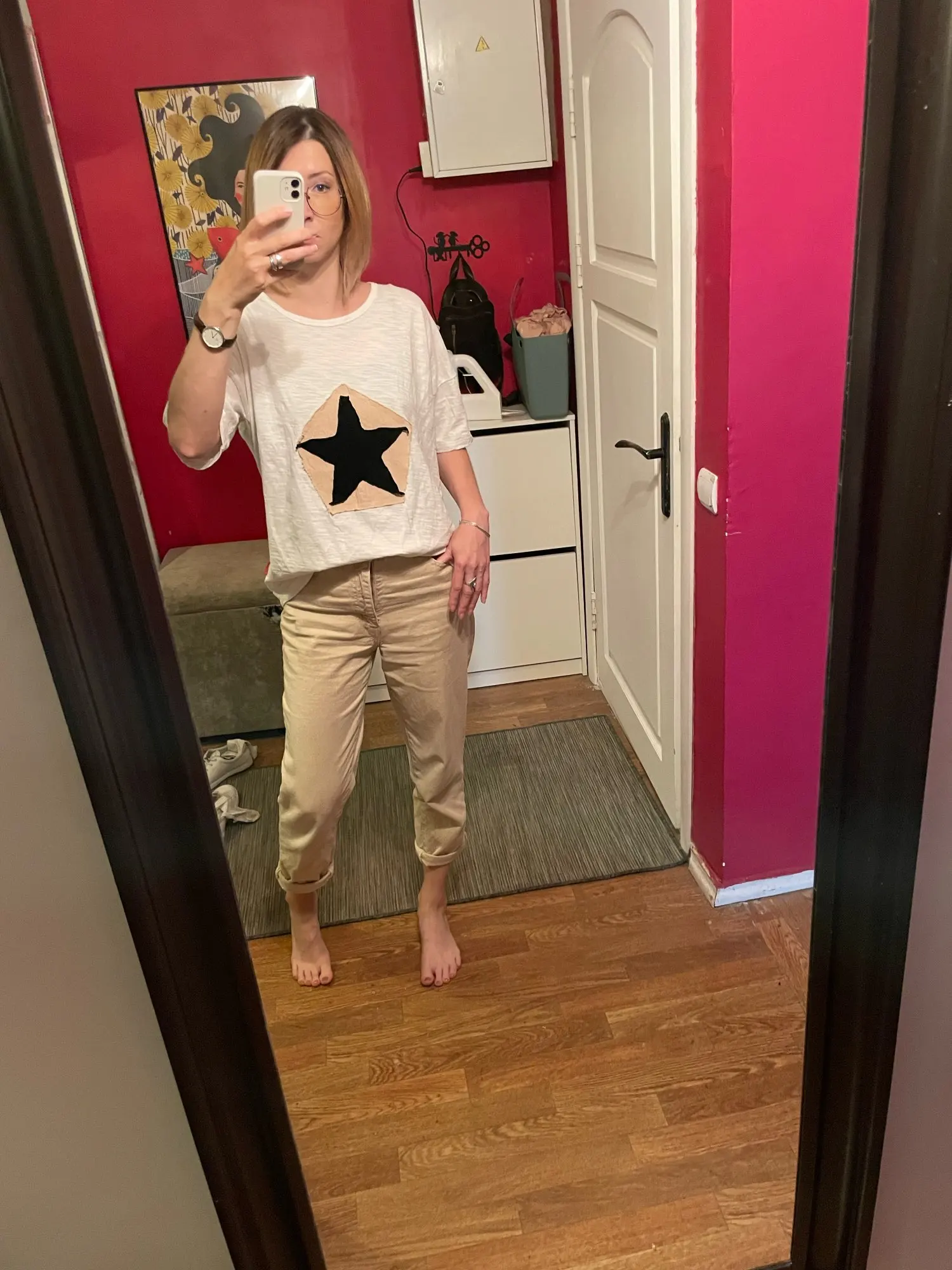 Пропорция футболки не соответствует заявленной продавцом на фото. Ткань белая немного просвечивает, легкая, 100% хлопок, очень приятный. Аппликация интересная. Ношу размер М, заказала L. Фасон отличный, смотрится как хороший оверсайз