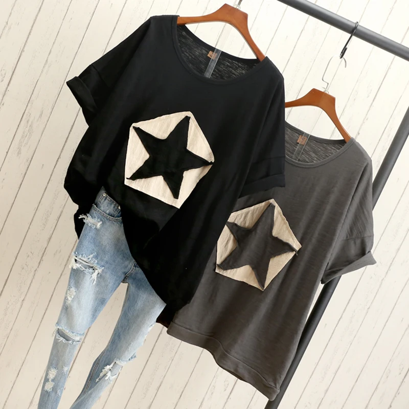 Женская свободная футболка размера плюс, модные повседневные хлопковые футболки со звездами белого, черного и серого цвета, топы, футболки из 100% хлопка, верхняя одежда