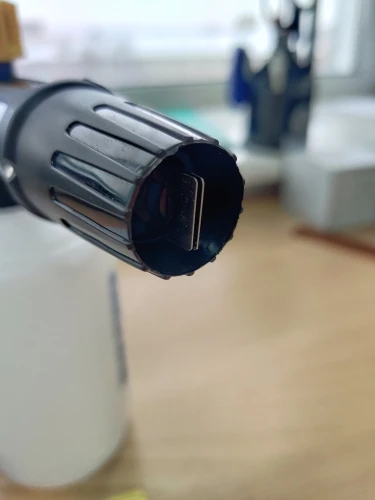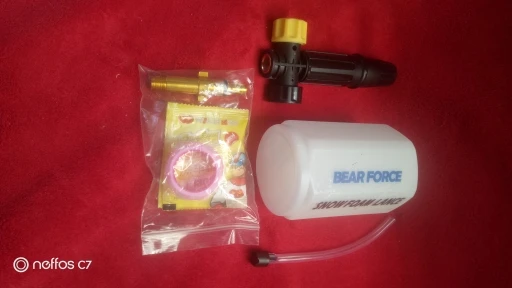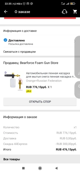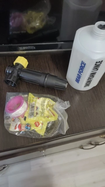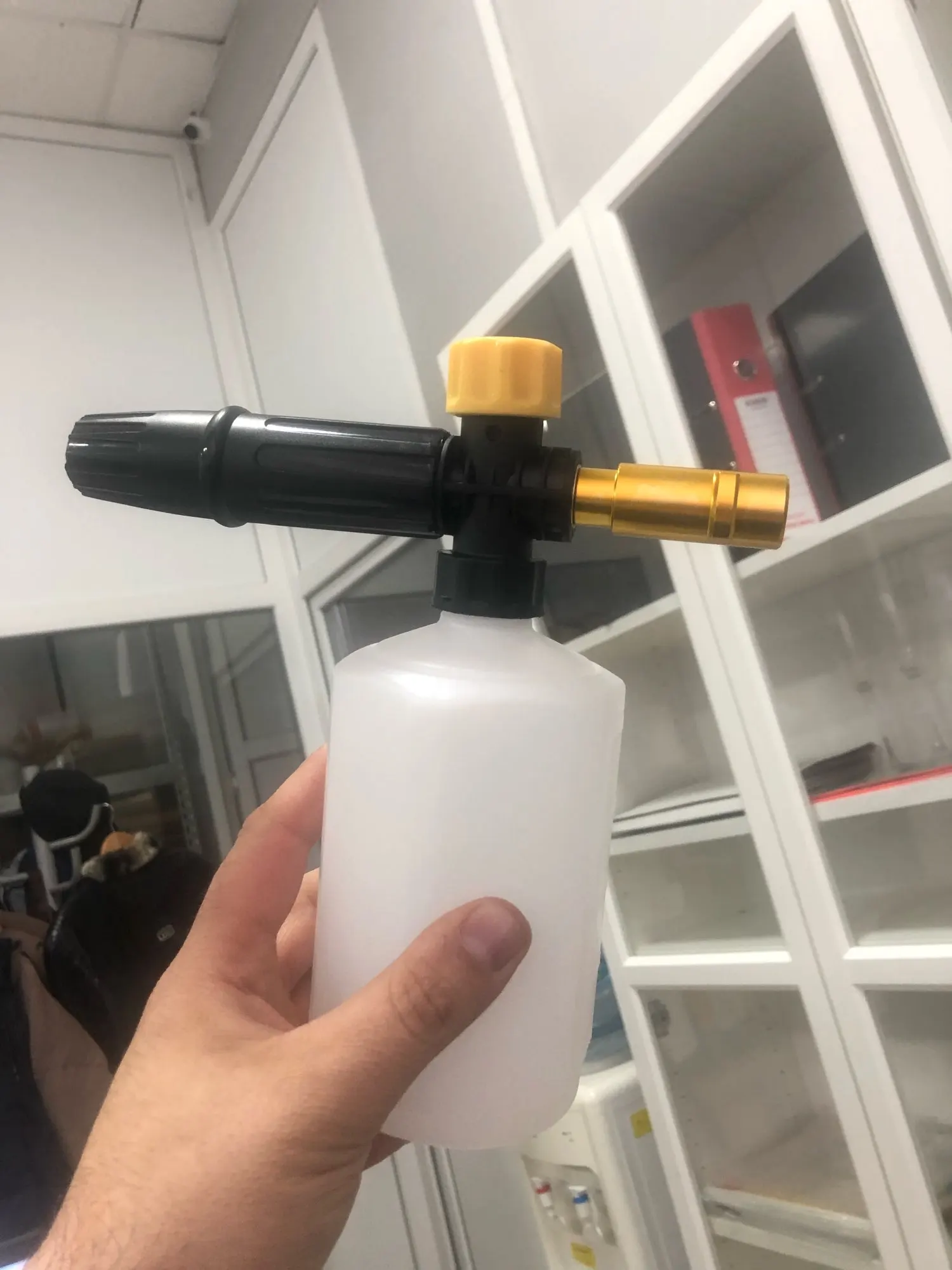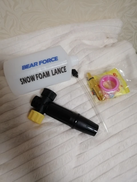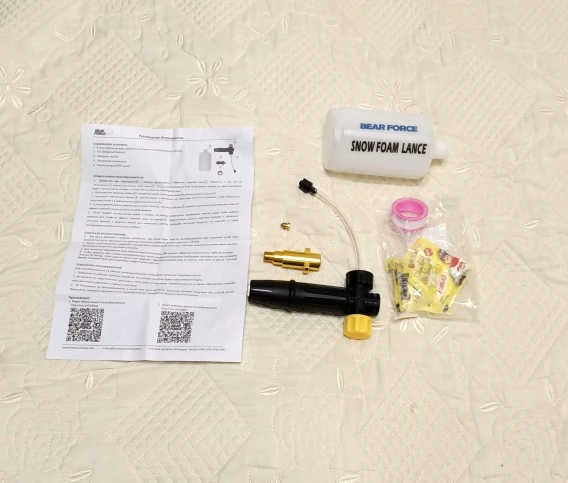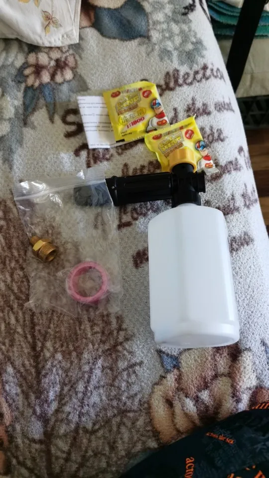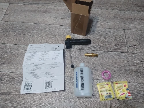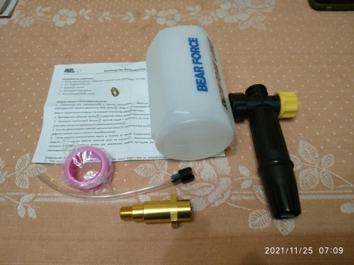 C доставкой через пятерочку вышло как-то не по расписанию (задержка на неделю). Сам товар очень понравился. Перед первой проверкой работы все разобрал, и как оказалось не зря!!! Внутри были остатки от сверления отверстий в корпусе наполовину забившие отверстия подачи пены. После профилактической чистки испытания показали отличный результат на самой простейшей автомойке ANLU 2.0 из Леруамерлен доставшейся мне еще лет 8 назад. Переходник отлично подошел, даже лучше чем родное копье. Пенит отлично. Пена GRASS Effect в пропорции 1:5, думаю даже можно попробовать чуть меньшую концентрацию. Регулятор воздуха на минимум - в сторону"-". рекомендую.