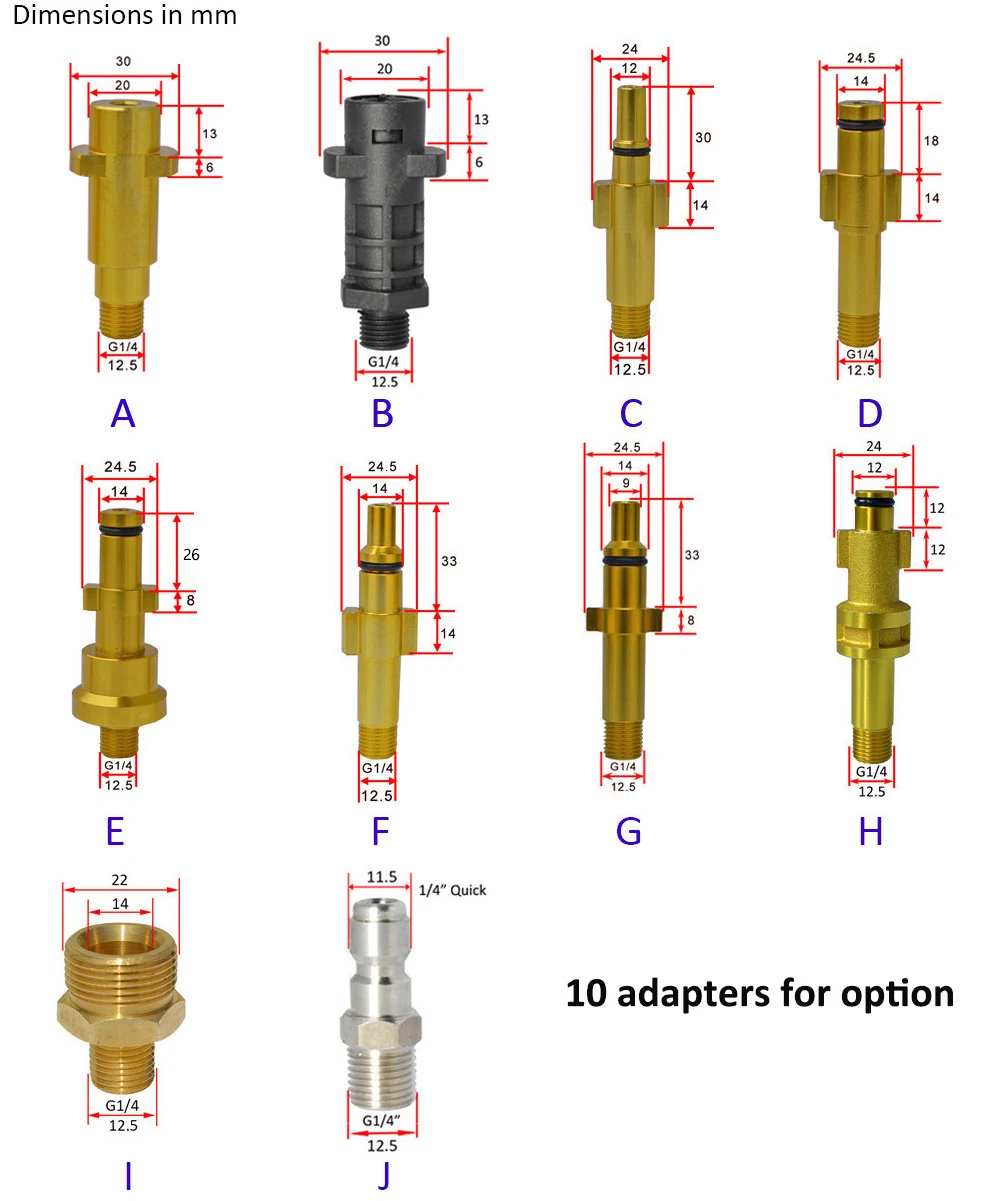 Заказ получил быстро, на третий день после оплаты. Продавец отправил быстро. Покупал позицию "D" для мойки CARVER CW1400A. Промерил пистолет штангелем и по всем размерам указанным в тех. данных о товаре подходит штуцер "D". Качество изделия хорошее, литье пластика бачка и непосредственно насадки хорошее, резьбы ровные. В комплекте инструкция, 2 подарочных пакета автошампуня, бачок, штуцер, насадка рапылителя с регулировками факела и подачи пены. В работе проверю и дополню.