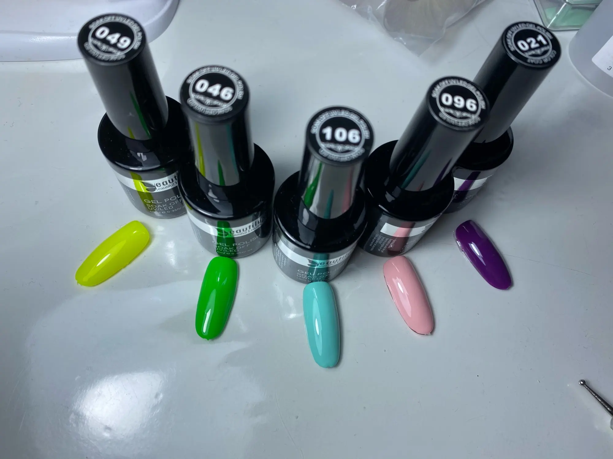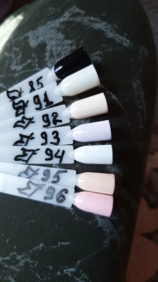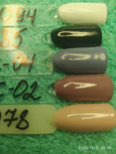 доставка 2 месяца до Калужской обл, забрала в офисе СДЕК. Цвета очень нежные, у продавца на фото цвета 91,92,93,94 кажутся все белыми. На самом деле нежные зефирные цвета. На типсу ложится более-менее, но на ногтях сложнее такие светлые оттенки. В любом случае не хуже, чем из магазина. В два слоя нормально.