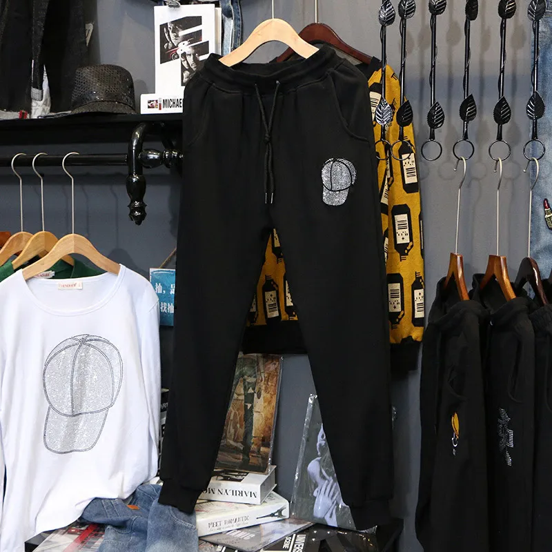 Новые женские весенние и осенние спортивные штаны 2021 года, модные штаны для отдыха, свободная шляпа с эластичной талией, с узором, женские брюки с горячими бриллиантами