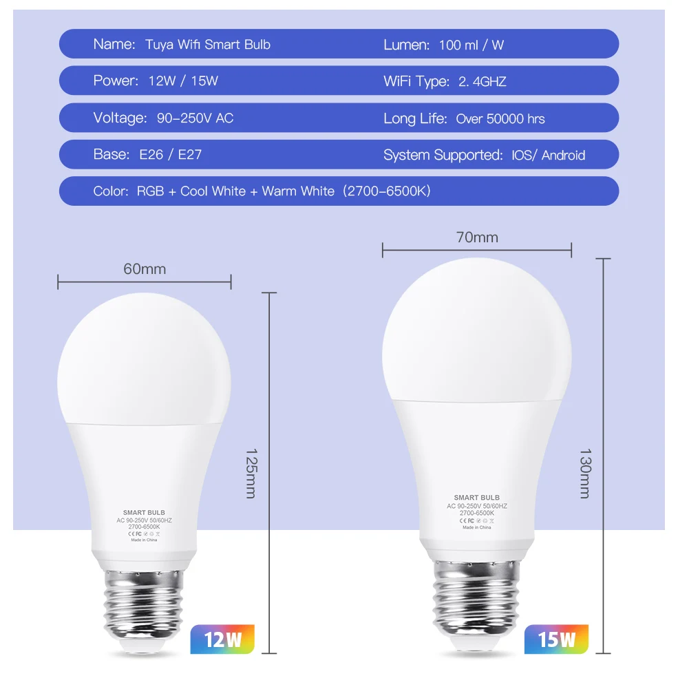 Умная светильник ПА E26E27 с Wi-Fi, RGB LED лампа, 12 Вт, 15 Вт, работает с AlexaGoogle Home Tuya Smart Life APP, приглушаемый RGB + белый + теплый белый
