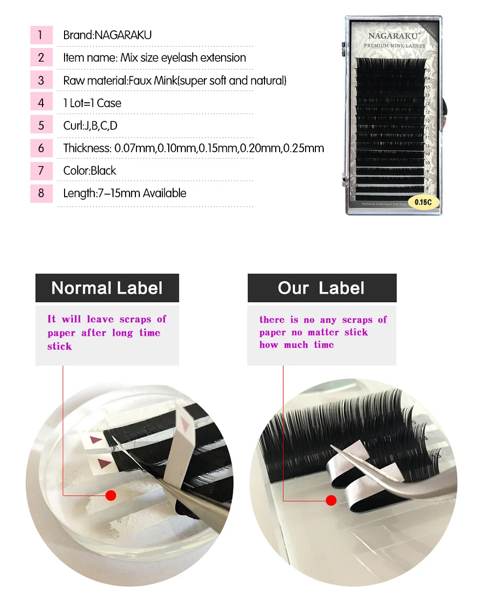 1. Специальный изученный материал Nagaraku подходит для LNS характеристики: светильник, натуральный, мягкий.2. Легко снимается с ленты.3. Форма остается оригинальной в течение 1 года.4. Высококачественные обои позволяют избежать остатков на держателе для ресниц, сильный клей делает переработку.5. Жесткая посылка позволяет избежать повреждения во время транспортировки.6. Мы являемся производителем, мы обеспечиваем быструю отправку по лучшей цене.7. Nagraku ресницы разрешены MSDS, SDS, полностью ручная работа, без теста на животных.8. Оптовые цены и индивидуальные этикетки являются предметом переговоров.Мы ответим на ваше сообщение в течение 24 рабочих часов.Если вы не получили товар в течение 45 дней, пожалуйста, свяжитесь с нами, и мы организуем возврат или повторную отправку.Мы высоко ценим ваши положительные отзывы.