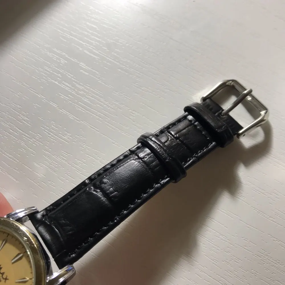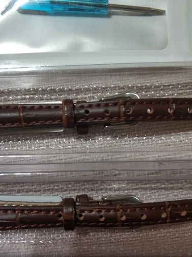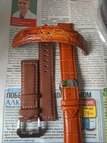 Доставка до Уфы 3 недели. Ремешок неплохой, довольно жестковатый, тиснение типа под "крокодила", сшит аккуратно. Разумеется, это не натуральная кожа, в лучшем случае экокожа, но за свою цену нормально, если на год хватит, то и ОК.
