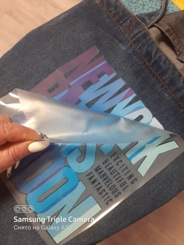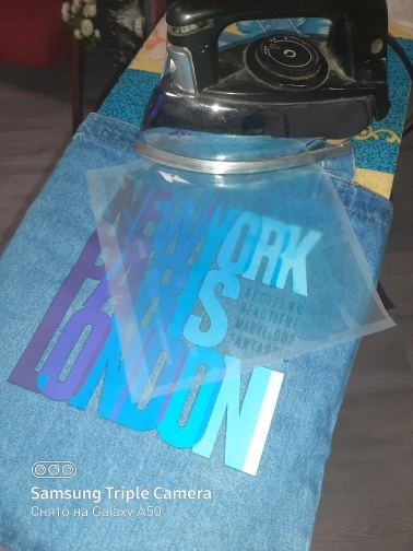 Непонятна мне инструкция. Думала как. Но продавец бонусом положил маленькую наклейку. Попробовала сначала на ненужной тряпке перевести маленькую наклейку, потом уже использовала по назначению. В принципе легко все получилось. Не стирала пока, будет ли сползать после стирки не понятно. Ещё у наклейки немного как бы рваный край по периметру, это видно после перевода. Причём и на маленькой и на большой. Т.е. как бы видно что это дешевая переводился а не печать на ткани.