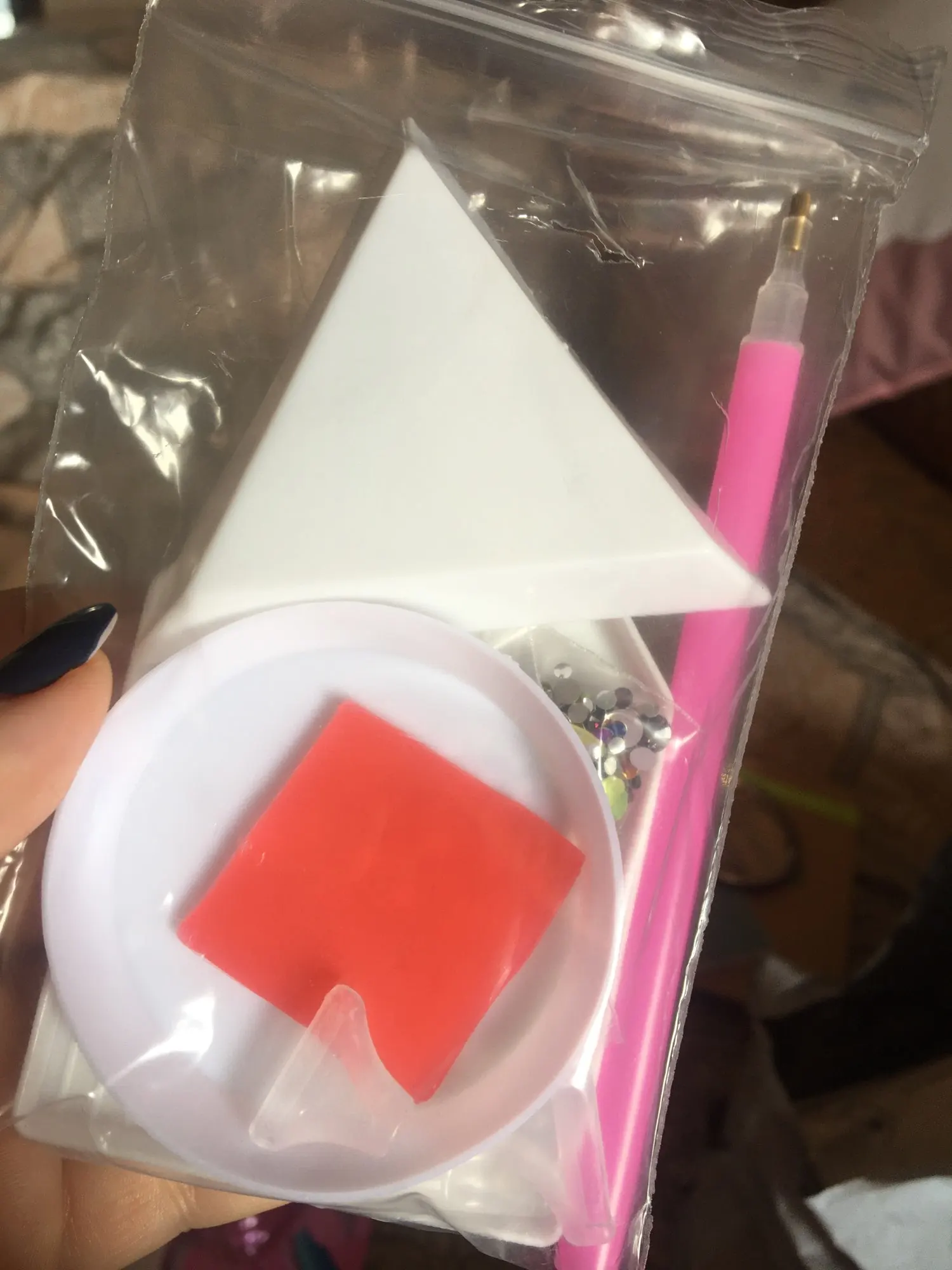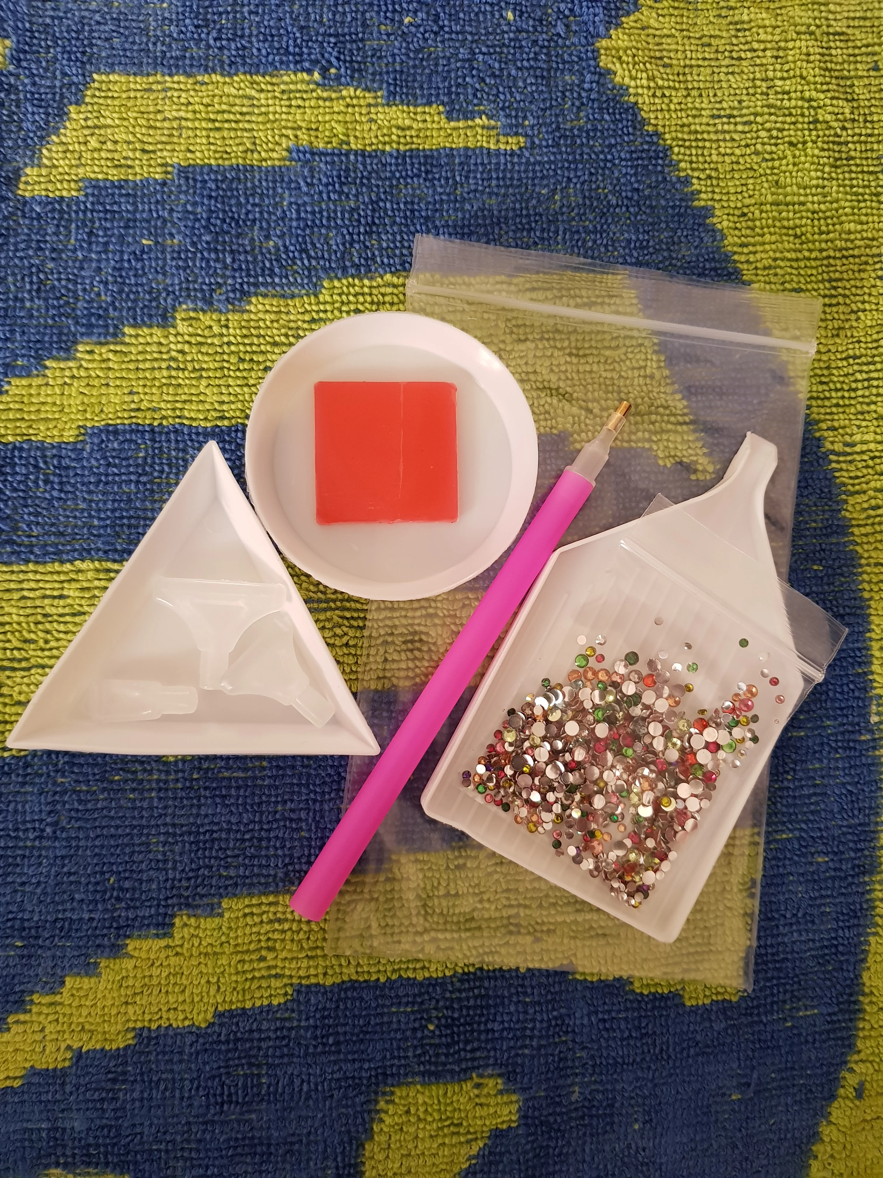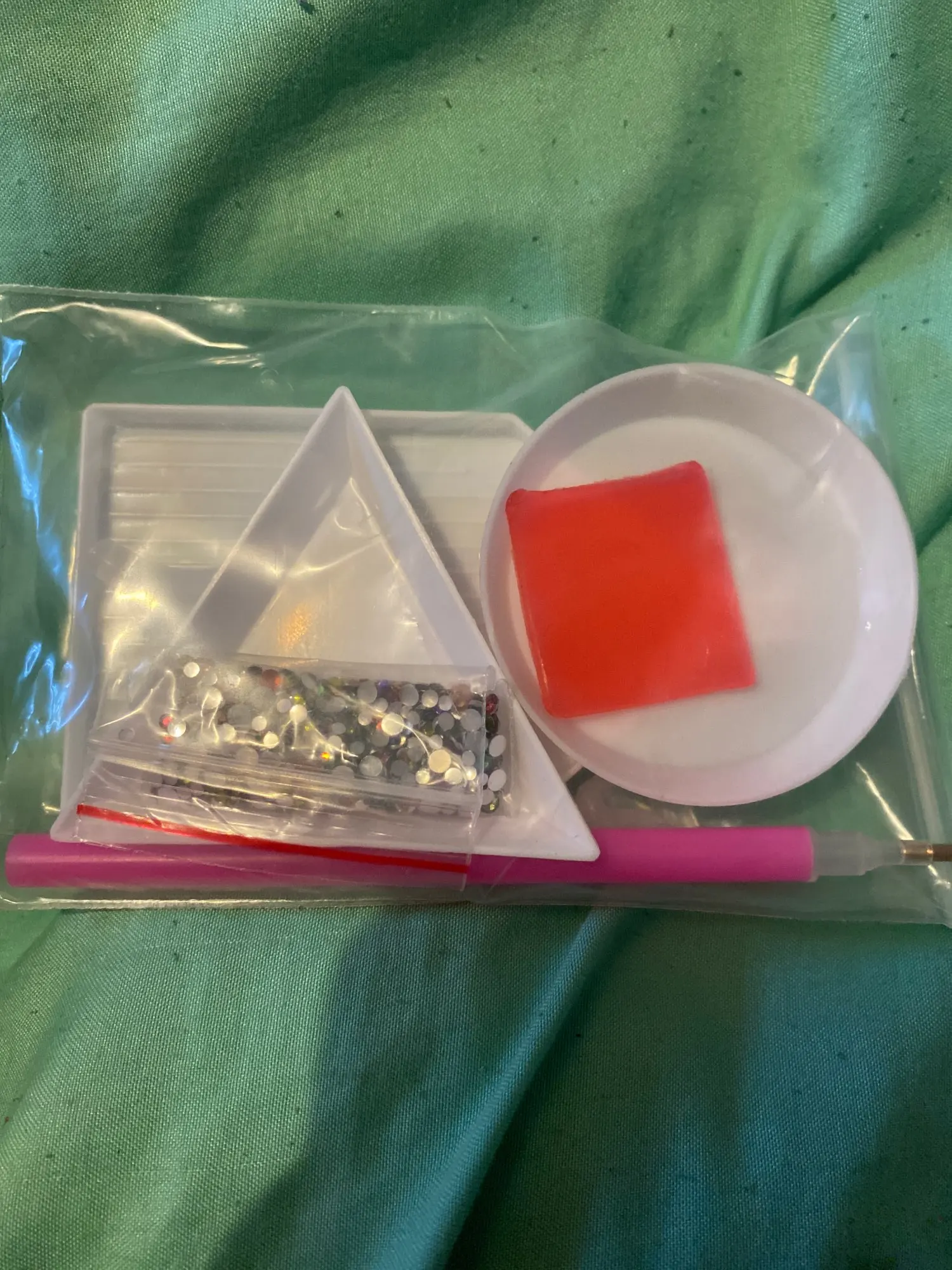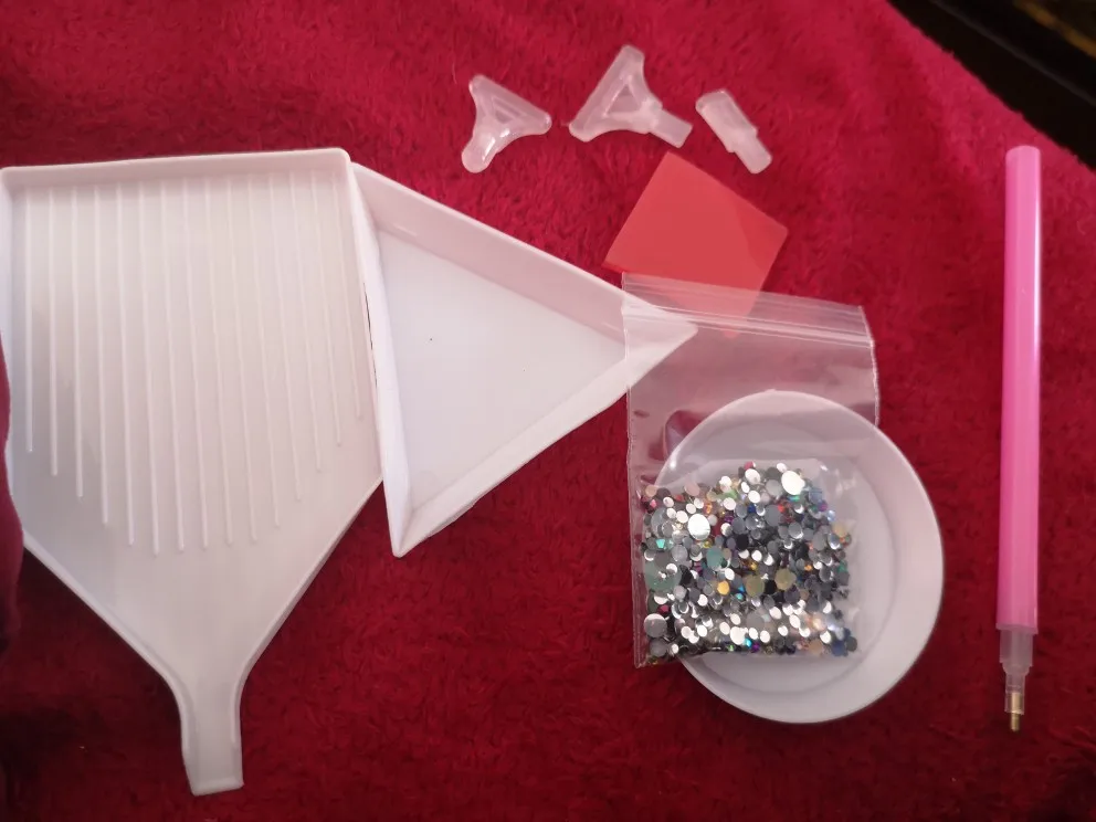 отправка быстрая, доставка около 2 недель. Комплект полный, описанию все соответствует. стразы плоские. Очень удобно в работе. кусочек воска только поломанный(