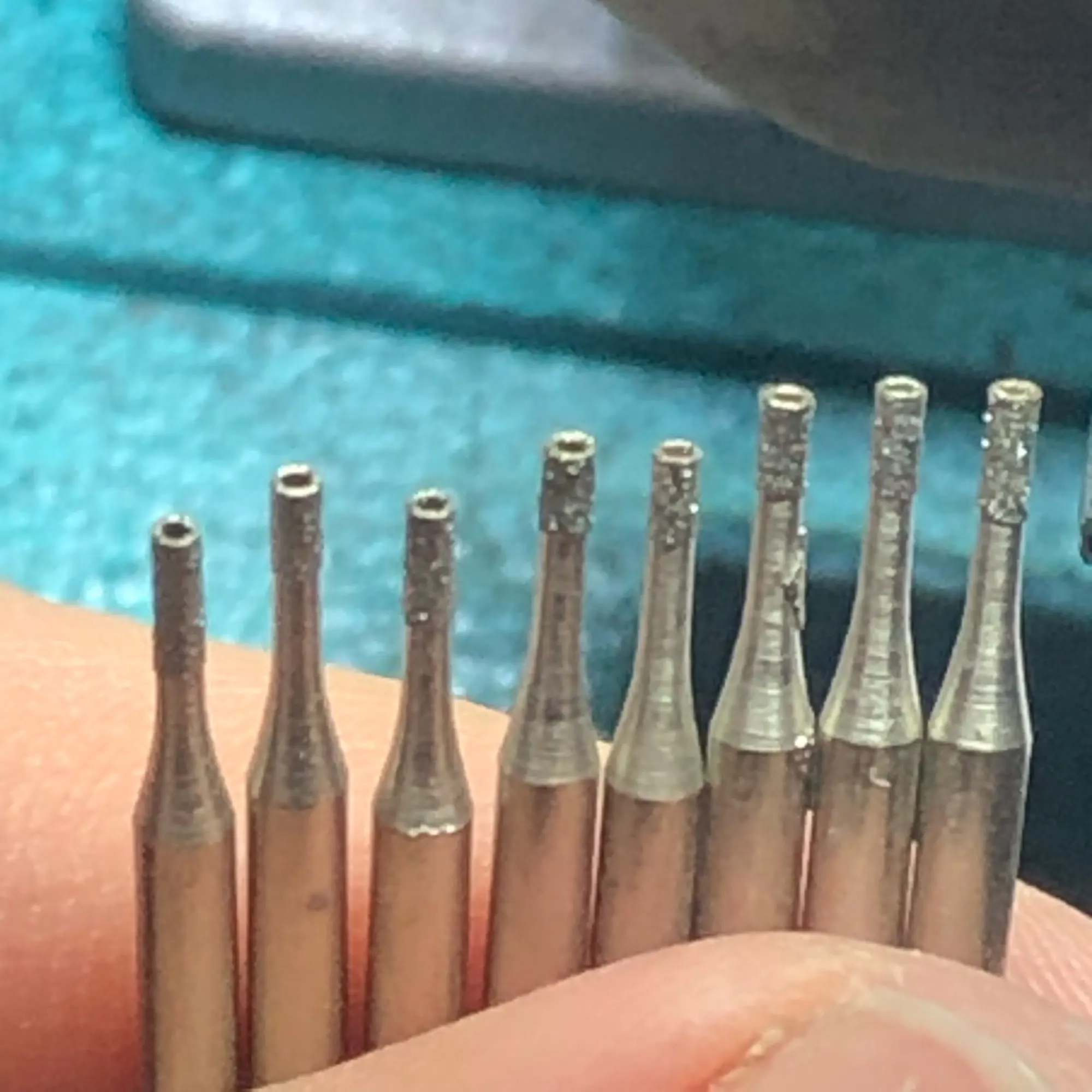 Очень доволен свёрлами, особенно тонкими - диаметр 1,2, сверлят отлично и на долго хватает при наличии охлаждения. Правда диаметр 2 мм, вопреки мои ожиданиям, мне не подошёл, так как внутреннее отверстие свёрла короткое и материал который сверлишь упирается в стенку.
