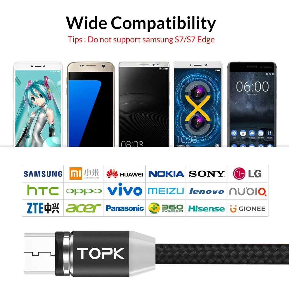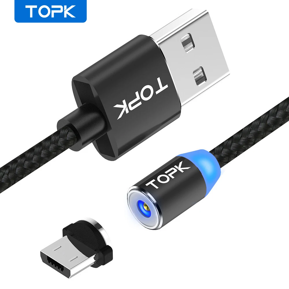 Магнитный кабель TOPK AM23, кабель Micro USB со светодиодным индикатором, в нейлоновой оплетке, зарядный кабель для Samsung S7 Edge, 1 м и 2 м