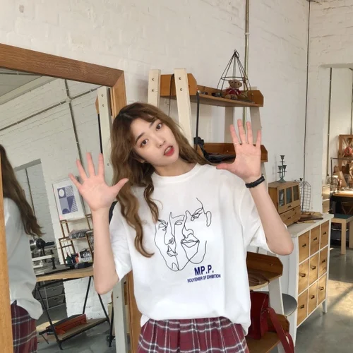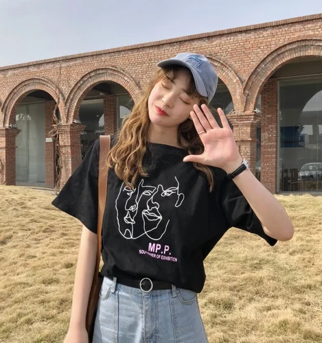 2019 Базовая популярная хлопковая простая Новая модная Свободная Женская футболка с милым принтом персонажа и коротким рукавом