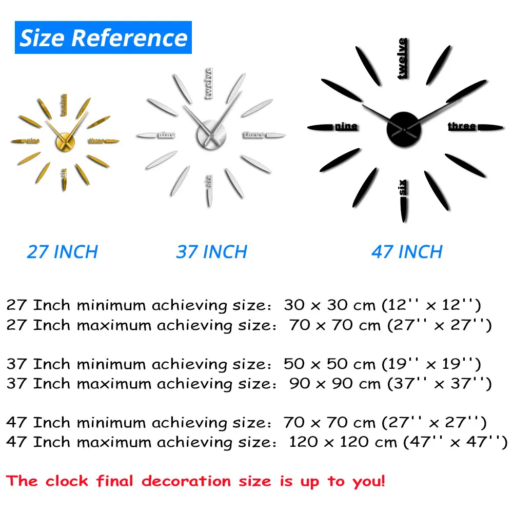 Часы нужны и используются время от времени по ясной причине, чтобы дать информацию о времени в течение дня. Современная версия часов используется не только для демонстрации времени, но и для украшения интерьера комнаты. Это захватывающая вещь, особенно для настенных часов DIY. Современный дизайн родил потрясающий дизайн часов. Эти удивительные дизайны действительно отличные варианты, которые нужно испробовать, и дизайн, безусловно, возбудит любителей DIY. Многие настенные часы изготавливаются на заказ и изготавливаются в домашних условиях.Эти часы обычно также большие по размеру. Попрощайтесь с маленькими настенными часами и Поздоровайтесь с большими и более интригующими большими часами на стене. Лучшие новости, каждый может сделать эти удивительные часы дома, если у них есть достаточно инструментов и материалов, и немного терпения.Материал наклейки: ЭВА пена (этиленвинилацетат)Материал часов: акрил с зеркальным эффектомЧасовая стрелка: 31,5 см/23,5 смМинутная стрелка: 39 см/31,5 смЧасовой механизм: 12 см/10 см