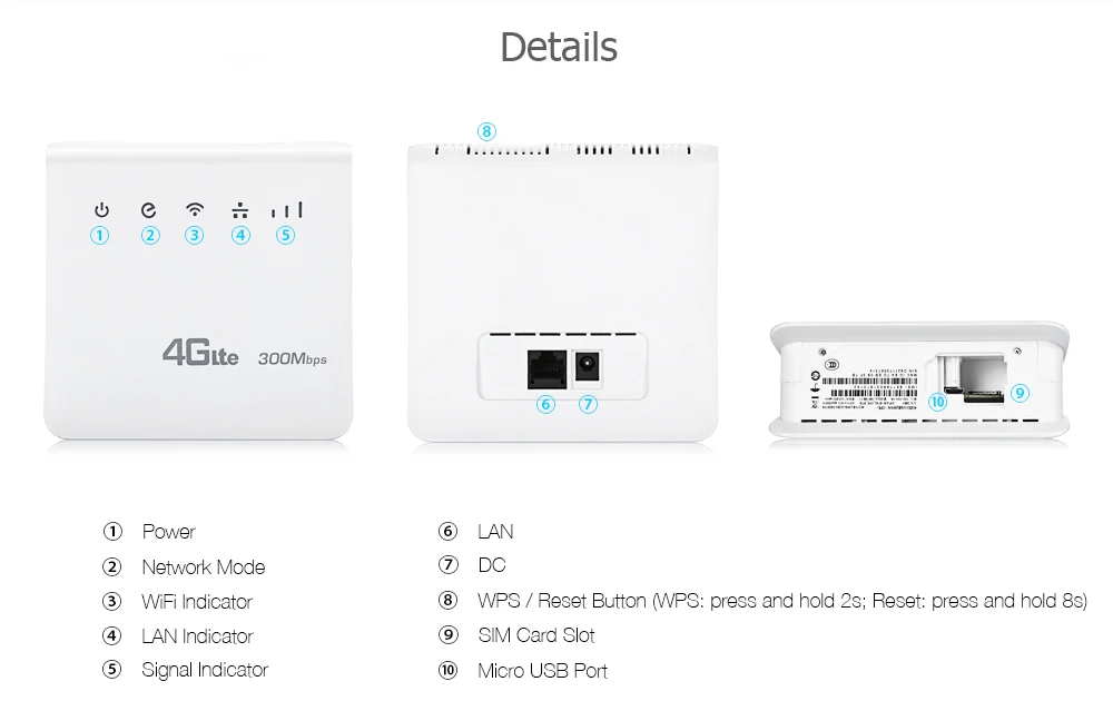 1. Восстановление настроек по умолчанию устройства удалит все предыдущие настройки. Когда устройство включено, нажмите кнопку reset и удерживайте около 8 с, чтобы восстановить настройки устройств по умолчанию.2. Чтобы предотвратить помехи, вызванные радиосигналами, поместите устройство на расстоянии не менее 1 метра от телефона и других электрических устройств.3. Чтобы не допустить несанкционированного доступа к сети Wi-Fi, рекомендуется время от времени менять SSID и пароль WiFi.4. Поддержка микро сим-карты, но не включает, youo нужно покупать у вашего местногоПосылка включает в себя:
