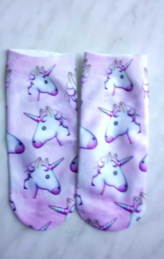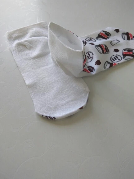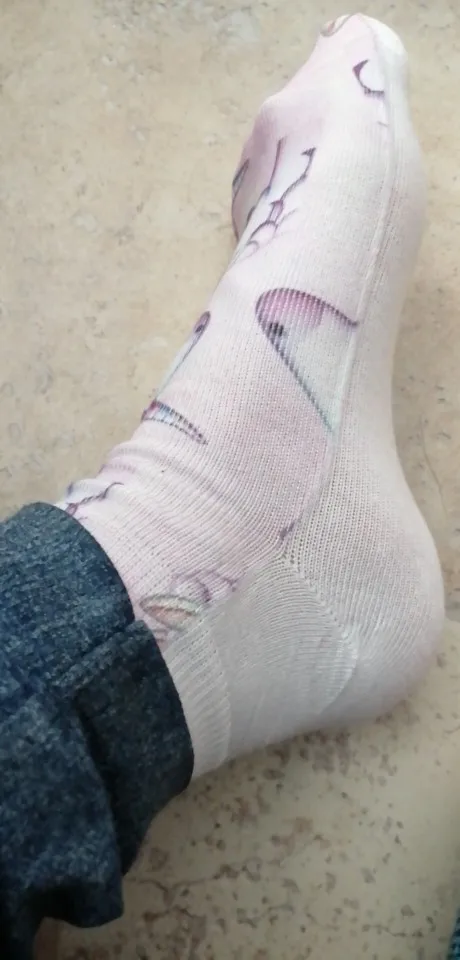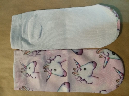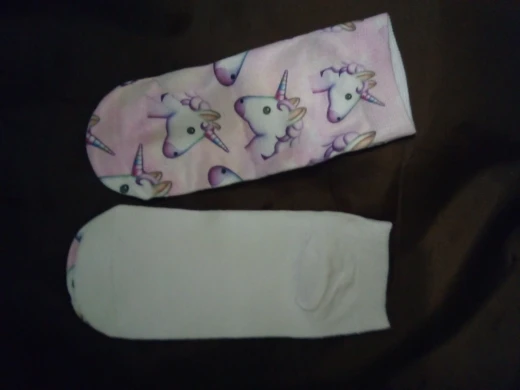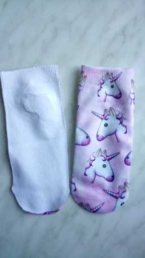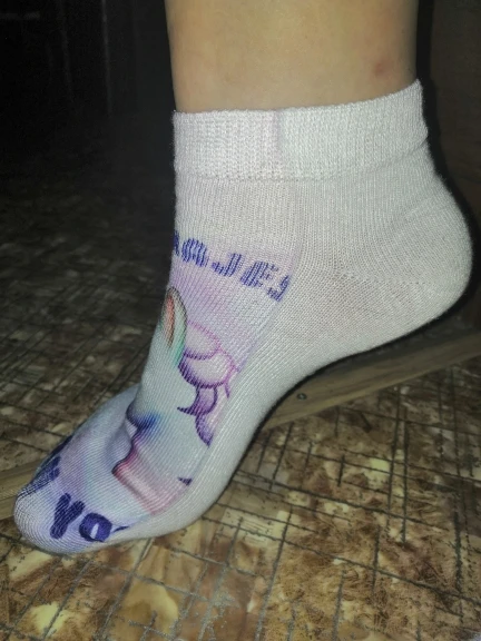 Отправка - 2 дня. Доставка бесплатная - 4 месяца, без отслеживания. Продавец, без проблем, продлил защиту. Повезло выиграть, всего за один цент и монетки, продавец все честно отправил. Цвет соответствует, очень нежный, принт хорошего качества, но он только сверху, нижняя часть носков, просто белая. Этикетки с составом, к сожалению, не было, на ощупь - синтетика, но мягкая. Идеально подошли на 37 размер, тянутся, но думаю, что на больших размерах, рисунок пойдёт в растяжку.