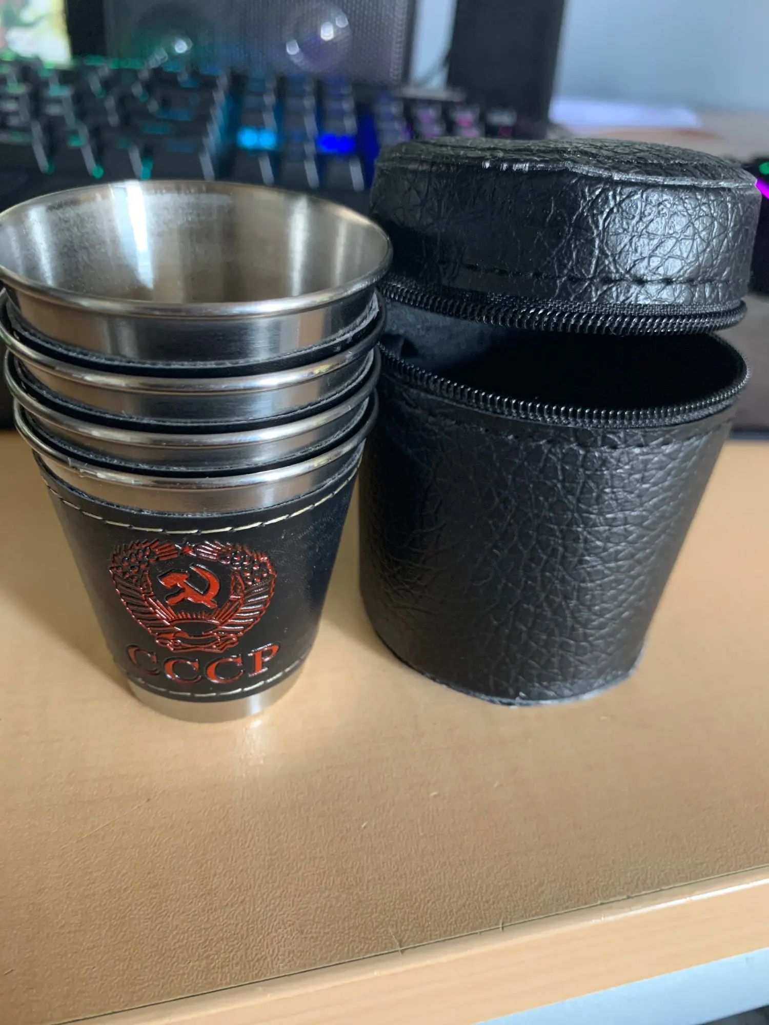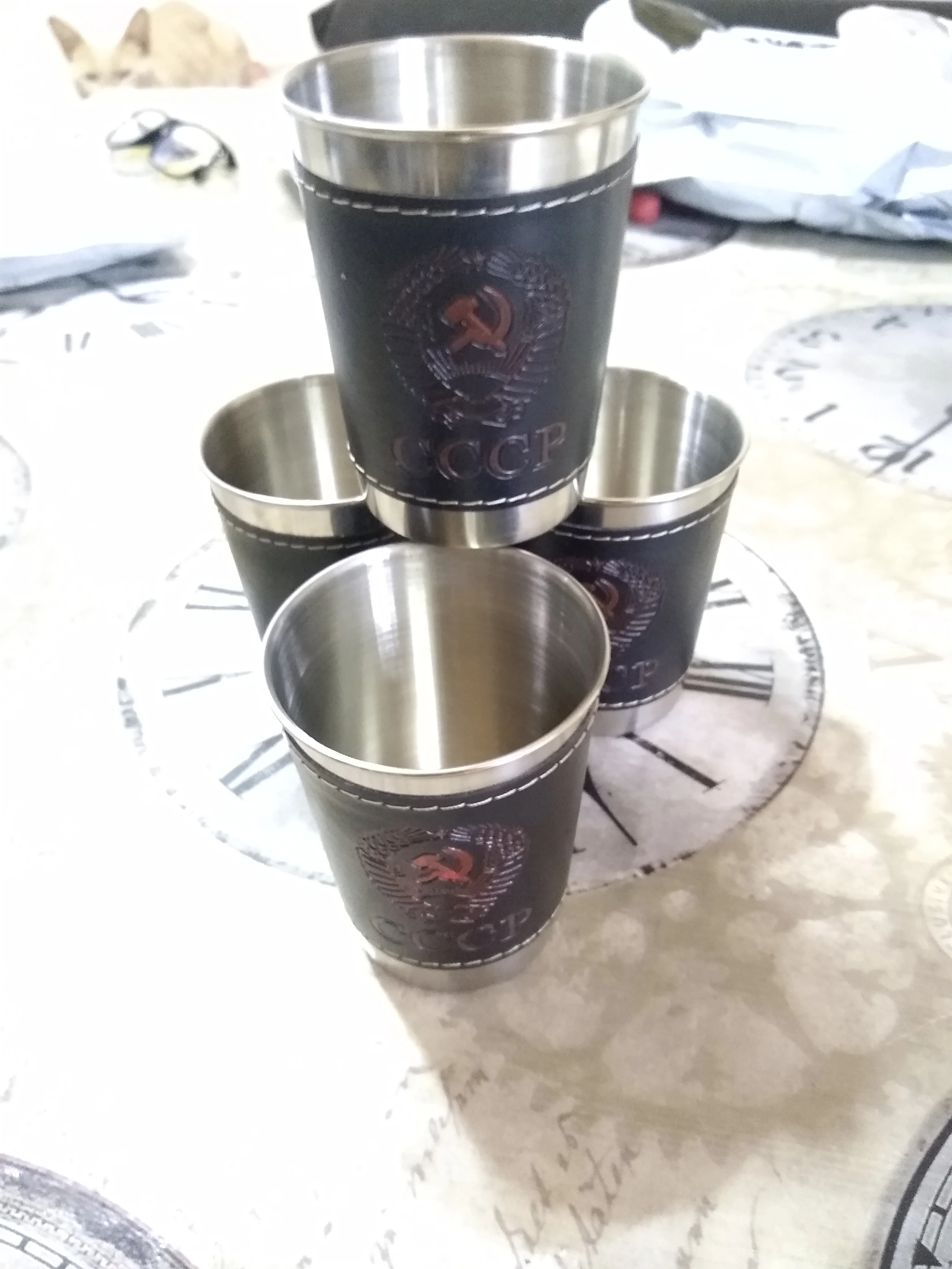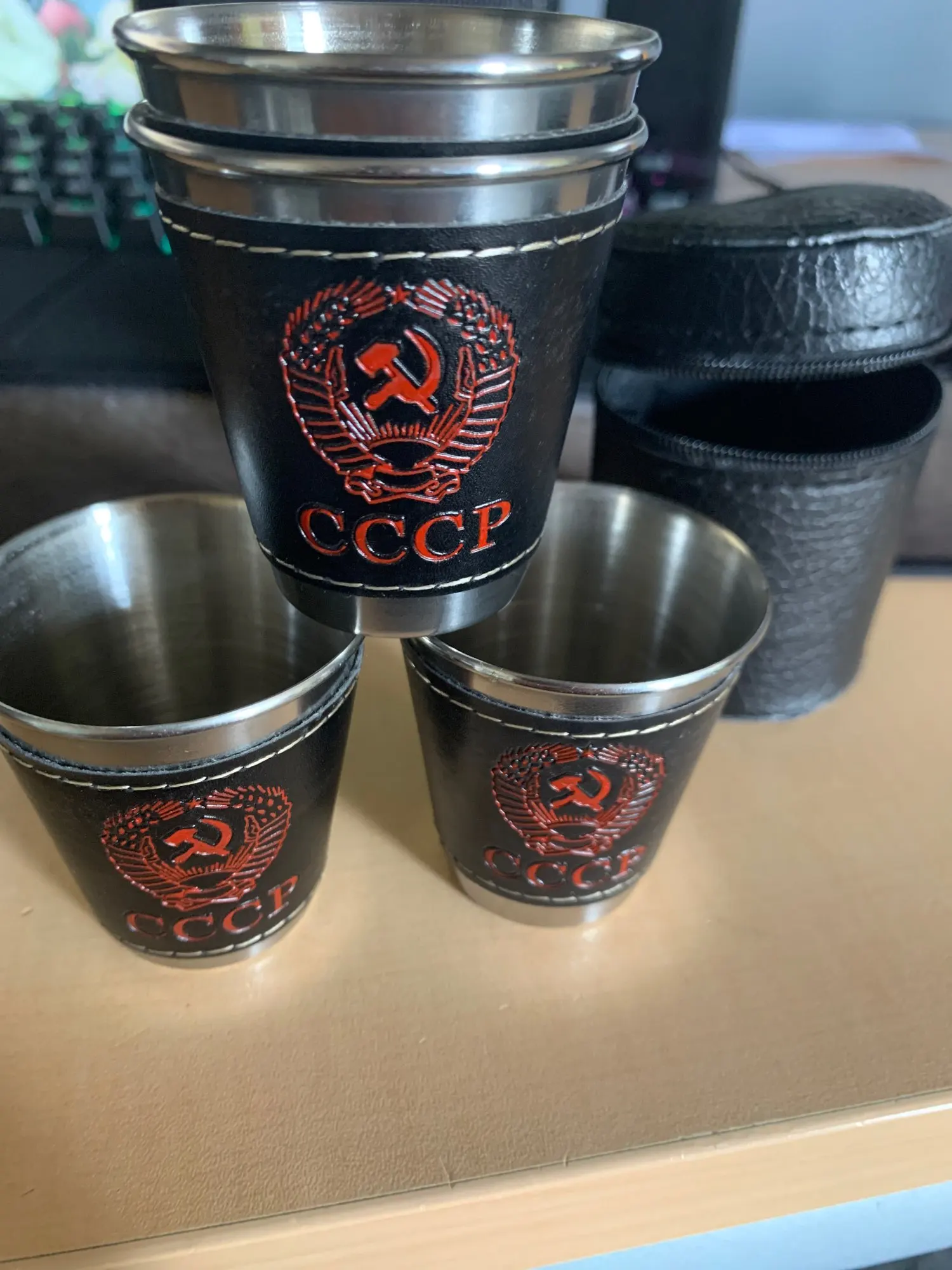 Стаканчики понравились. Вечные. Может быть, чехол из кожзама порвётся, а стаканы всегда будут целыми. Тиснение "СССР" годится вполне. Продавца рекомендую однозначно.