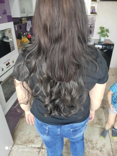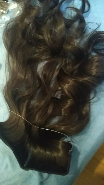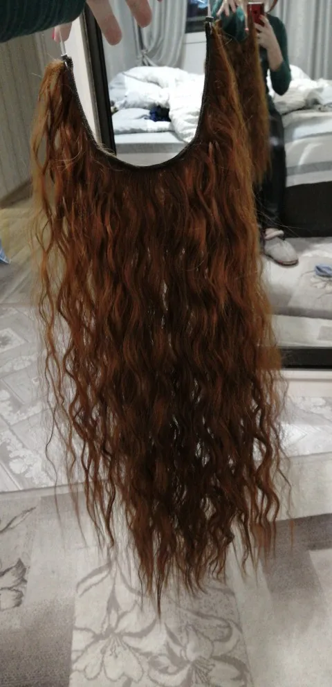 цвет немного не устроил, но в целом хорошая прядь. держится хорошо безо всяких заколок или клипс. немного подкарнала концы вертикально, чтобы выглядело более естественно. если свои заплести в косы крупные, и распустить после высыхания, будет вообще огонь. лески не видно, главное следить, что бы не топорщились волосы. цвет брала темнее, т к у меня двойная покраска, темное и светлое